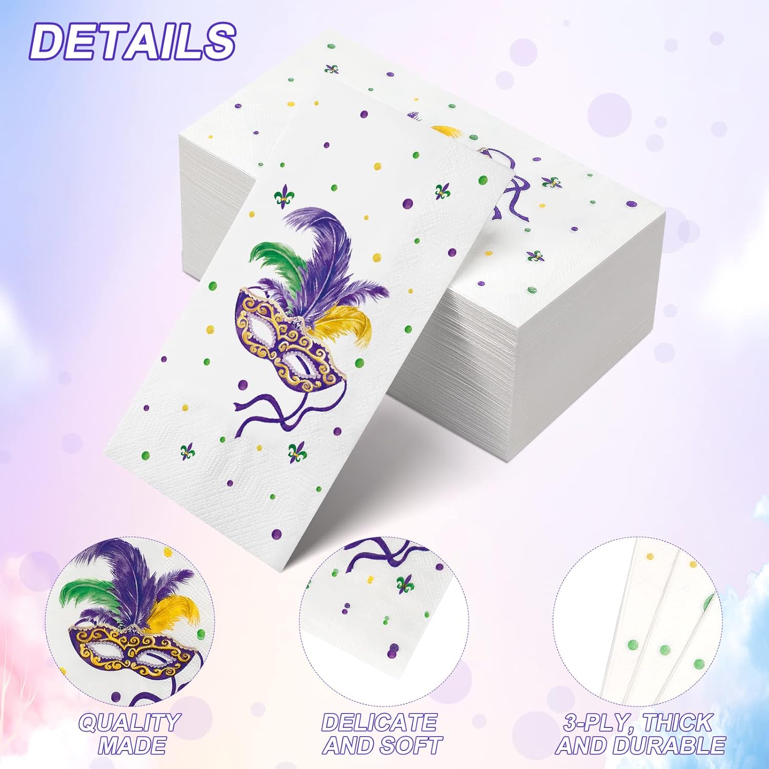 Features: Variety collocations: Mardi Gras party supplies dinner napkins can match with New Orleans theme party tableware including masquerade dancing plates, cups and decorations (not included), add a carnival atmosphere to your party. Good display: These masquerade dancing party napkins designed with beautiful feathered masks and fleur de lis can stylishly display your delicious cocktails, nice for serving appetizers, desserts and snacks, which make your party become funny and relaxing. Specifications: Material: paper Color: as shown in the picture Size: Folded: 7.9 x 4.3 inches Unfolded: 15.8 x 13 inches Package includes: 100 x Napkins for Mardi Gras Warm tips: Due to computer resolution, sunlight, indoor lighting, and other factors, there might be a little color difference. Please allow slight errors on size due to manual measurement.
