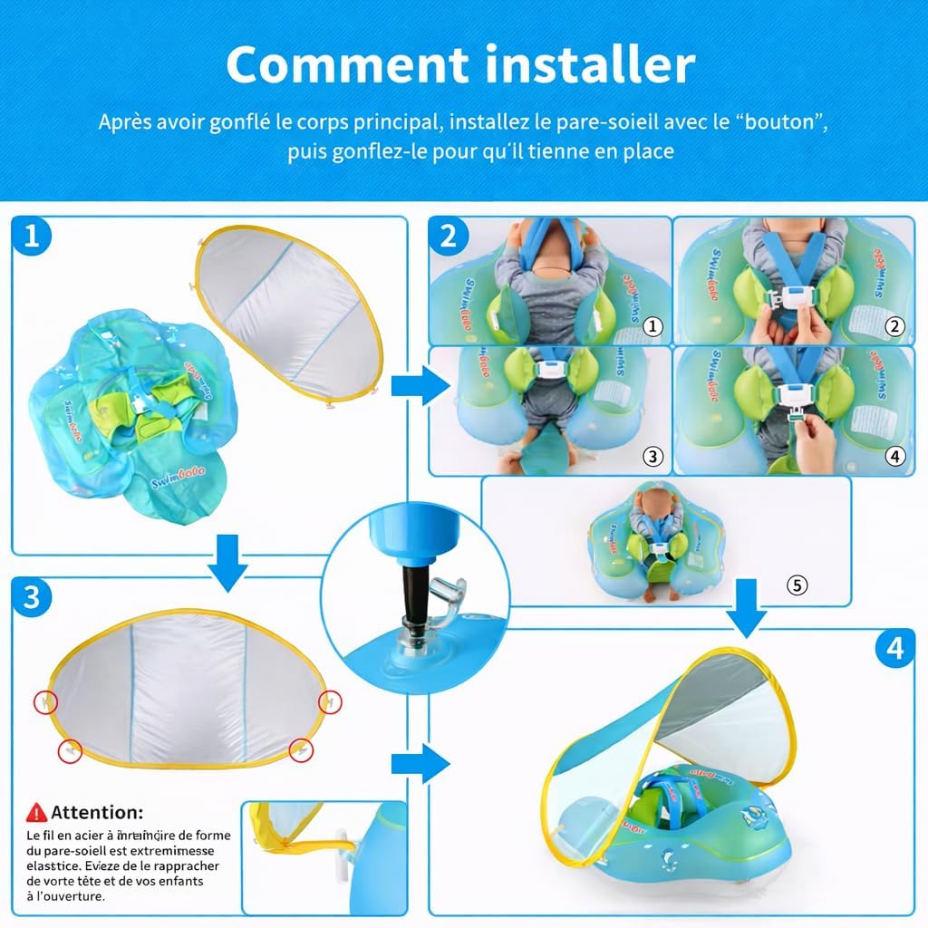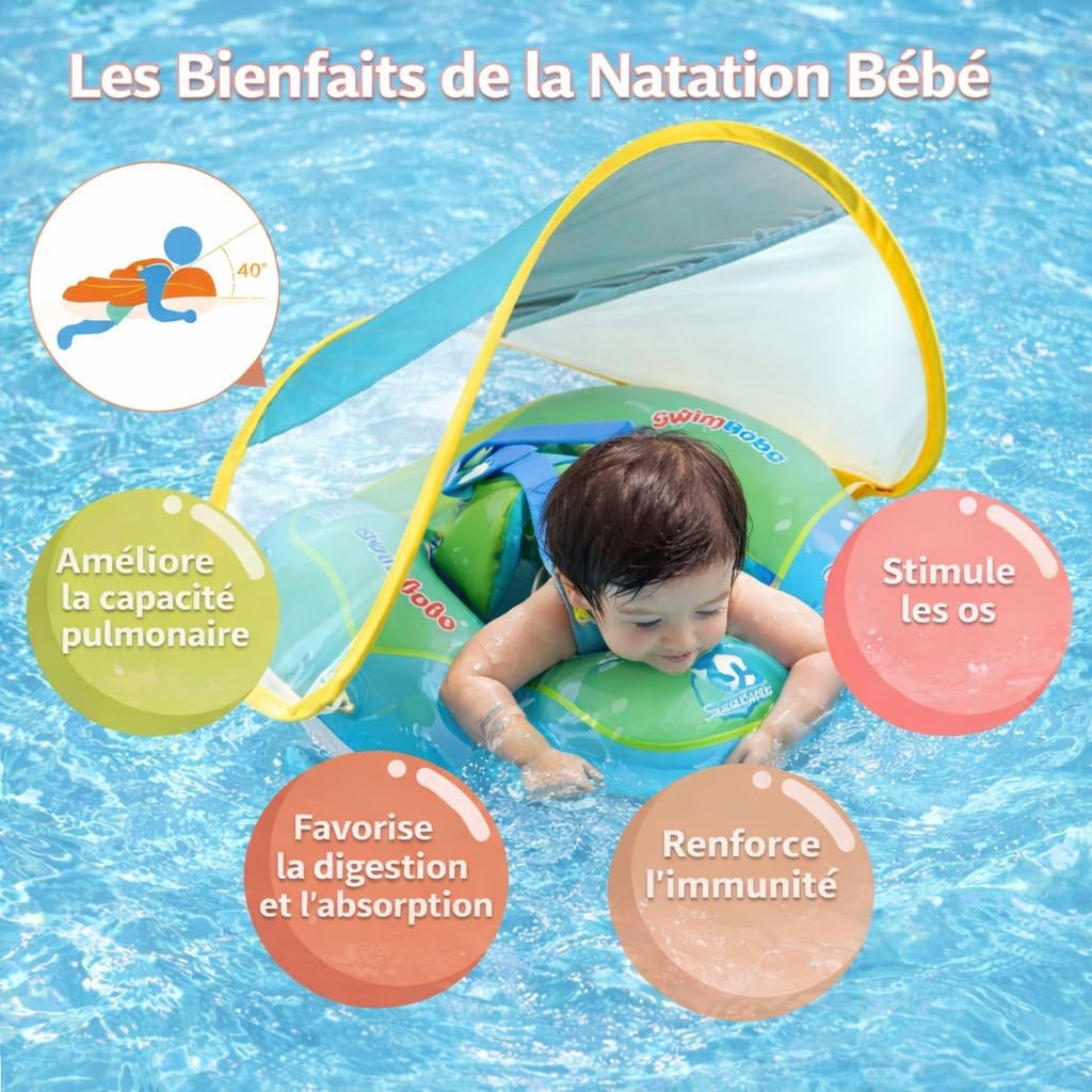 Give your child a safe and enjoyable first water experience with this baby swim ring. Designed especially for babies and toddlers, this swimming pool buoy features an ergonomic seat with safety harness, allowing baby to stay well supported while enjoying the water. Its design promotes a natural and stable position, ideal for gently discovering the pool or the sea. Made of high quality reinforced PVC, the buoy ensures excellent wear resistance and optimal buoyancy. Its playful and reassuring design with child-friendly motifs makes it a practical and aesthetic accessory. This buoy also includes a sun protection canopy, ideal for protecting baby's sensitive skin from UV rays during swimming. ️ This product is not a life jacket and should always be used under adult supervision.