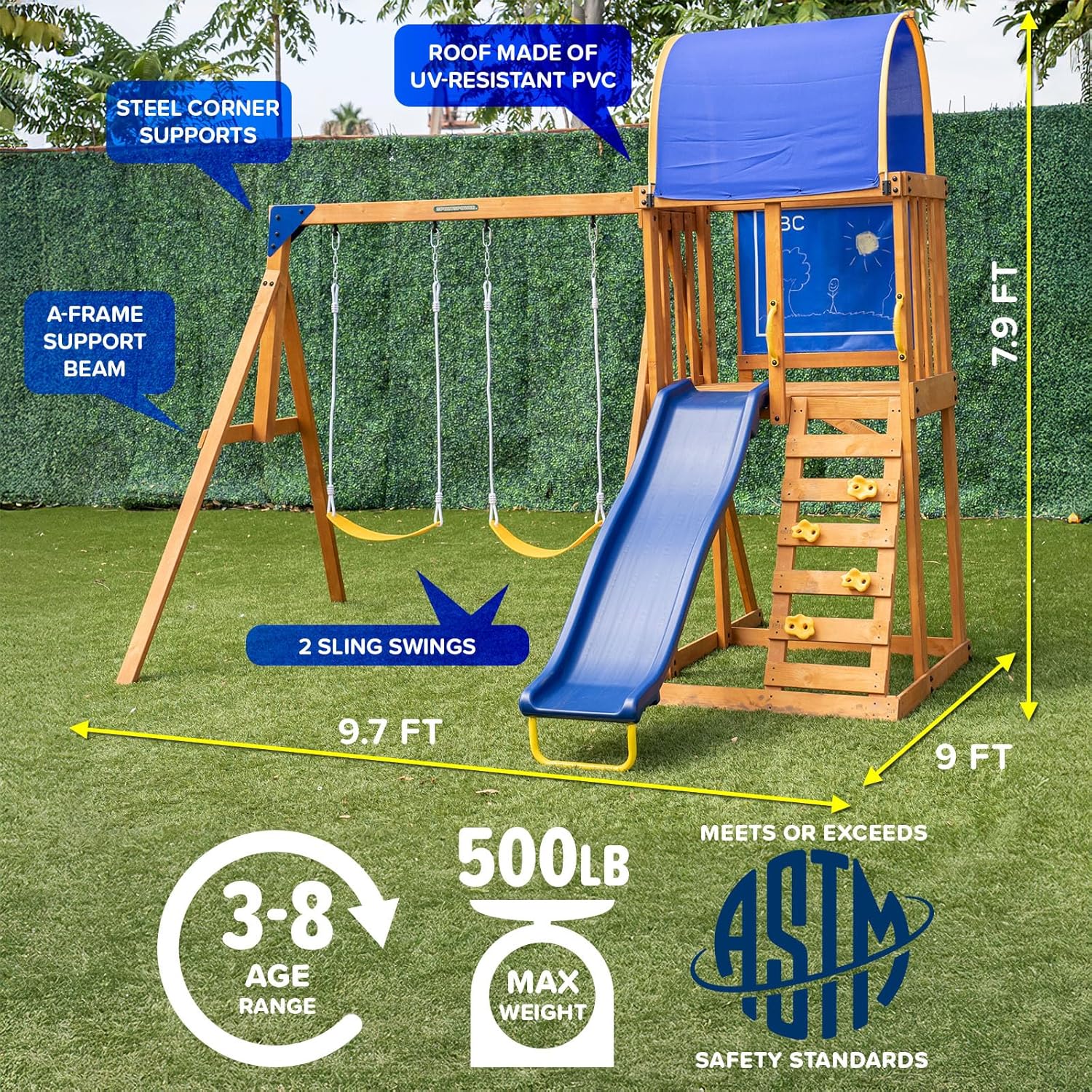 The Sportspower Augusta Wooden Swing Set brings all the fun straight to your backyard! This swing set has a double A frame, that our competition does not, providing extra stability and safety. The set includes 2 sling swings that are height adjustable, a rock climber that leads the playfort deck with canopy, a sandbox and a 6ft double walled, blow-molded slide for extra durability. Competition uses single wall slide. With the variety of playing elements, your kids will exercise and work on their motor skills, all while having fun. All Sportspower products meet or exceed all ASTM safety standards, so kids and parents can both enjoy the Augusta Wood Swing Set with a peace of mind. Limited LifetimeWarranty on the slide. Bonus anchor kit included.