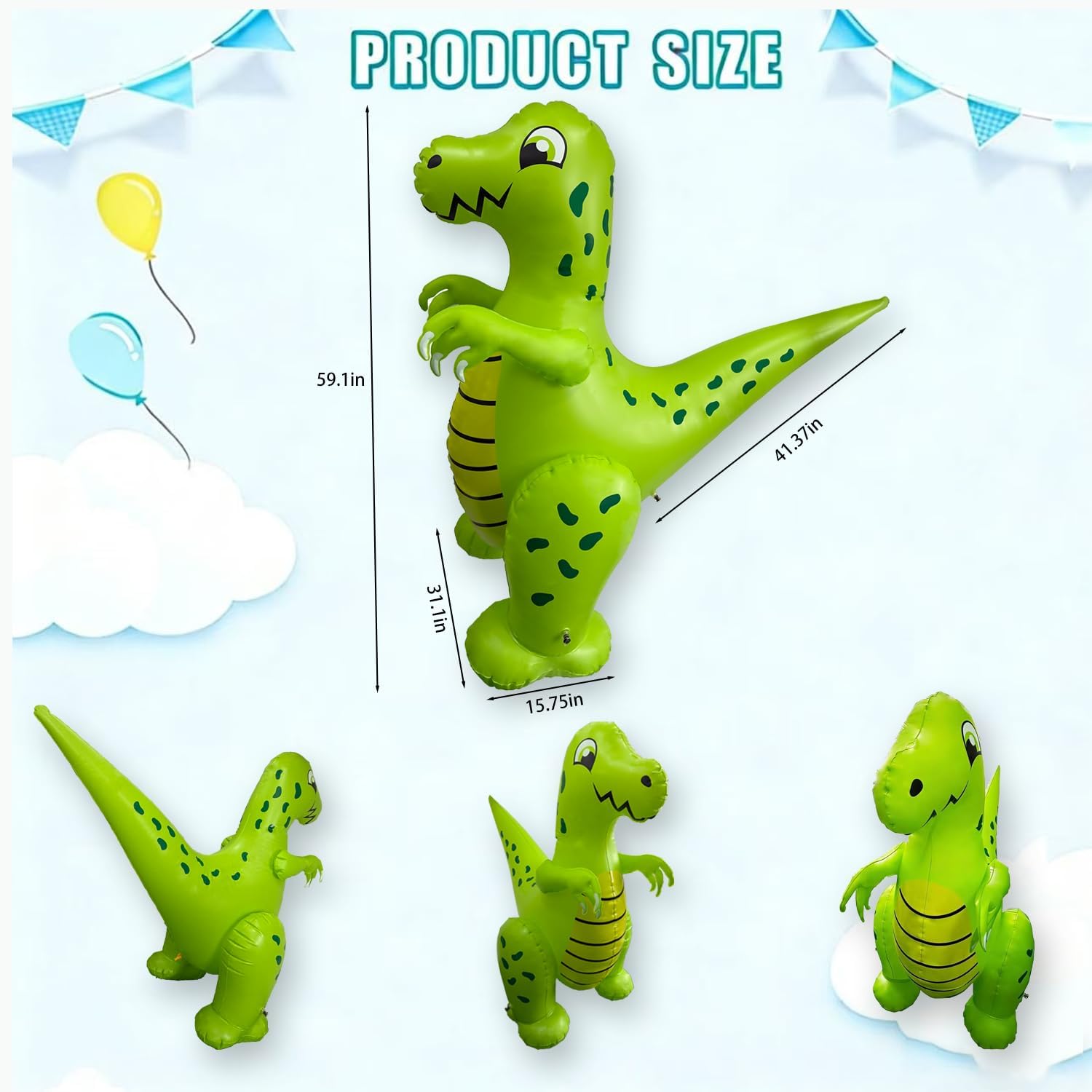 This giant inflatable water-spouting dinosaur sprinkler brings prehistoric fun to your backyard this summer! Standing an impressive 59 inches tall, this vibrant green T-Rex features an adorable friendly face with big expressive eyes and a cheerful smile that kids will love. Simply connect a standard garden hose to watch water spray from the dinosaur's head, creating an exciting sprinkler effect that keeps children cool and entertained for hours. The sturdy inflatable design with a wide base ensures stability during active play, while the eye-catching green color with detailed spots and stripes adds visual appeal to any outdoor space. Perfect for birthday parties, playdates, or everyday summer fun, this oversized dinosaur sprinkler encourages active outdoor play and helps kids beat the heat. The generous size makes it suitable for multiple children to play around simultaneously, promoting social interaction and imaginative play. Easy to inflate and deflate for convenient storage when not in use, this water toy transforms any lawn or garden into an exciting water park adventure that will have kids roaring with delight all season long!