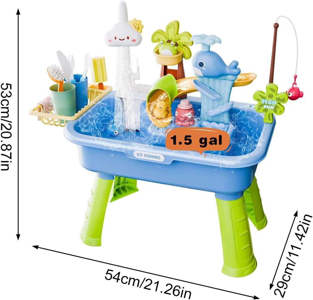 The play sink with running water is an engaging activity sensory play set designed to inspire imaginative role-playing games for them. Equipped with a pump, it creates a realistic running water experience, perfect for interactive and fun learning. This versatile set includes a fishing game, encouraging hand-eye coordination and cognitive development while entertaining them. Ideal for summer use, it enhances outdoor play at the beach or pool, providing endless possibilities for exploration and creativity. Designed to provide a dynamic gaming experience, this game sink supports sensory development and promotes social interaction in groups. Whether used indoors or outdoors, it brings fun and enriches playtime thanks to its innovative design. The play sink with running water ensures a delicious combination of education and entertainment, making it a must-have for young active minds. Specification Product material: ABS Product size: approx. 54 x 29 x 5 3 cm/21.26 x 11.42 x 20.87 inches. Product weight: 1200g Power supply: 4 x AA batteries (not included) List Water table for * 1 piece. Accessory set**1 piece Note: 1. Due to lighting effects and display angles, there may be color differences in the product. 2. Due to manual measurement, there may be errors in the size of the product, please understand.