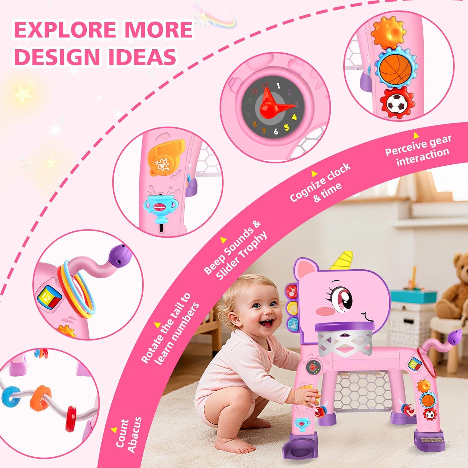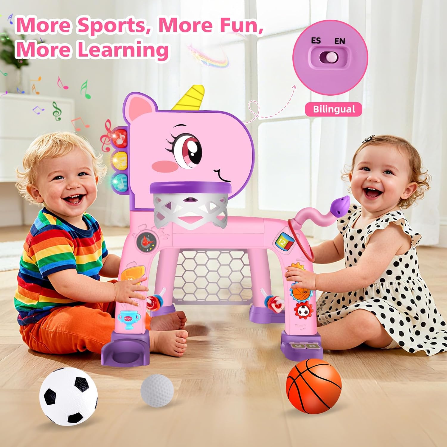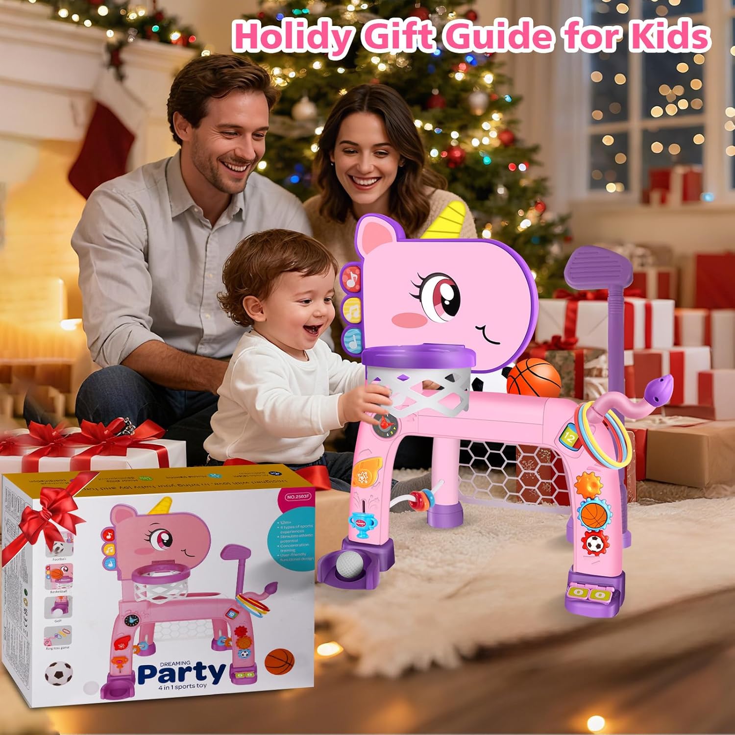 | Included Components | 1 * kid-friendly golf club with ball, 1 * mini basketball, 1 * soccer ball, 1 * unicorn sports center, 3* colorful rings for ring toss |