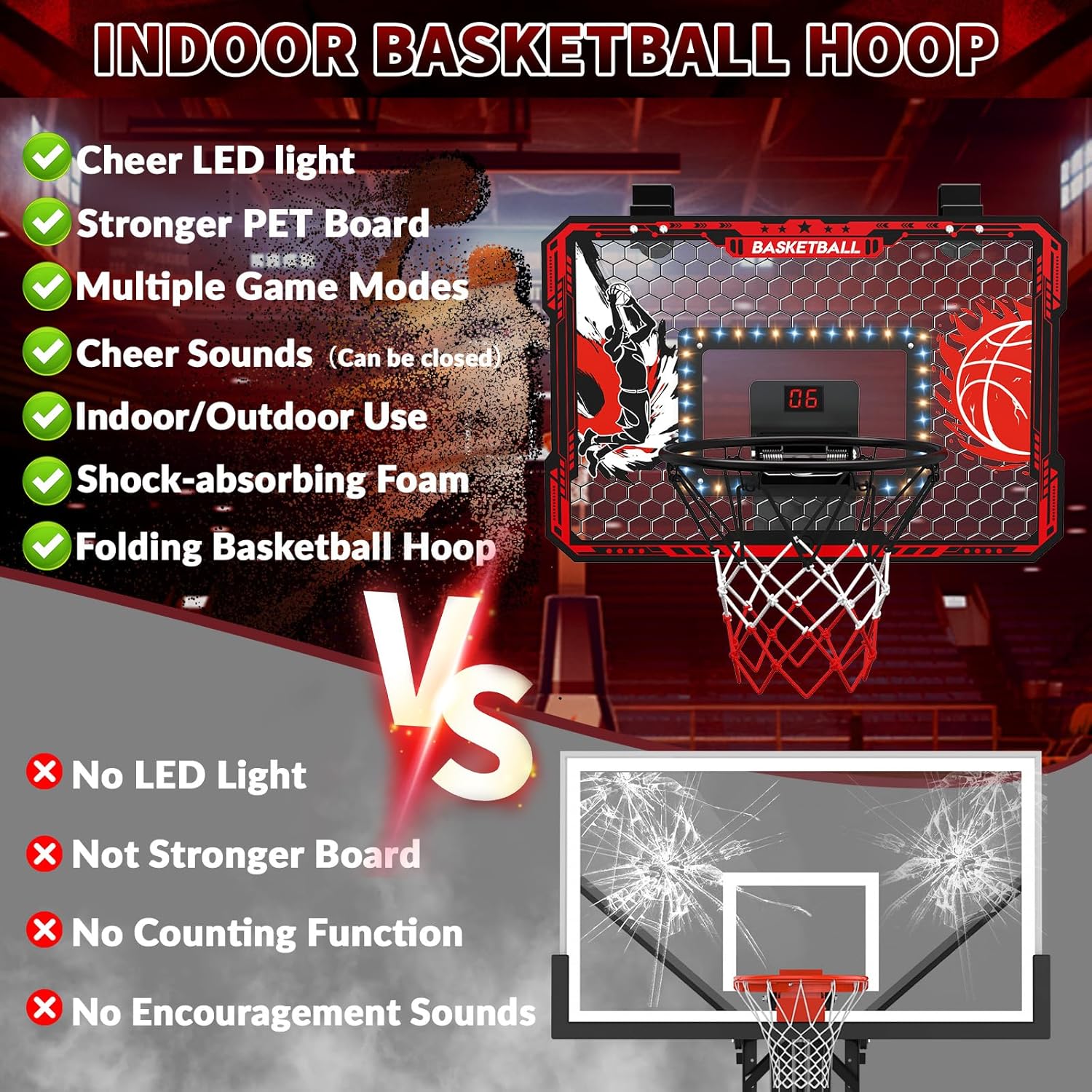 | Additional Features | LED Lights, Electronic Scoring System, Breakaway Rim |