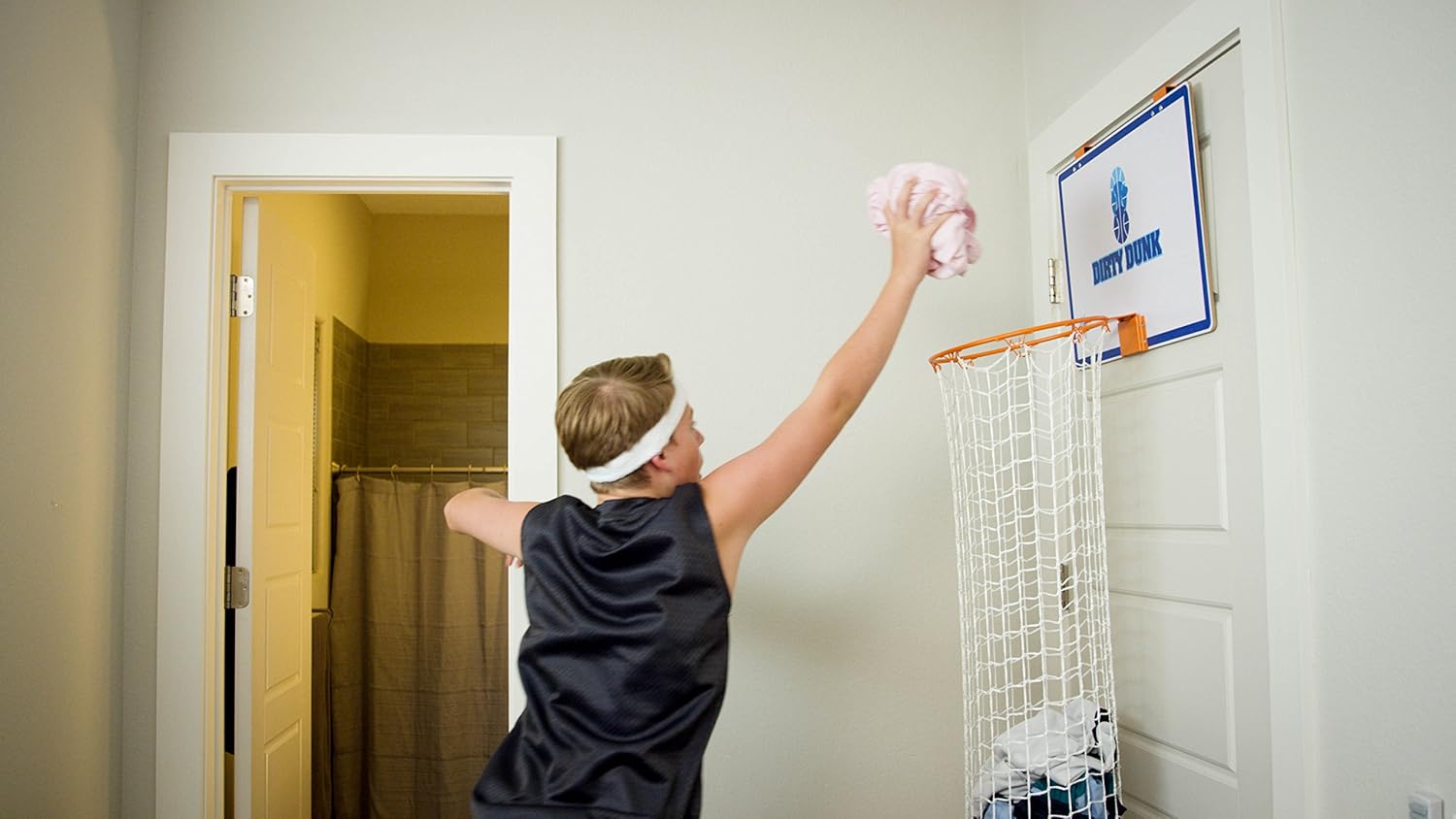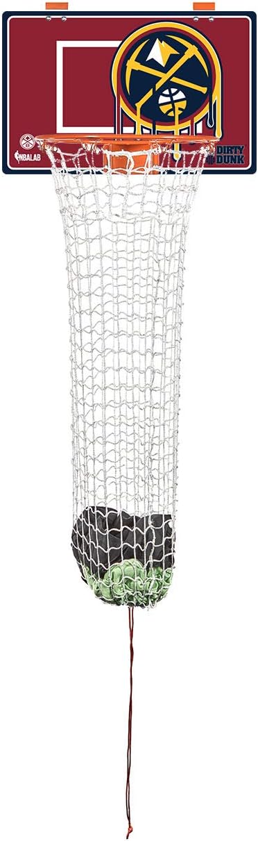 The dirty dunk is the Original over-the-door basketball hoop laundry hamper. Turns chores into a game and puts and end to clutter floors and messy piles of clothes. Has an authentic metal rim while the quick release drawstring clasp makes unloading hassle free. Easy to assemble.