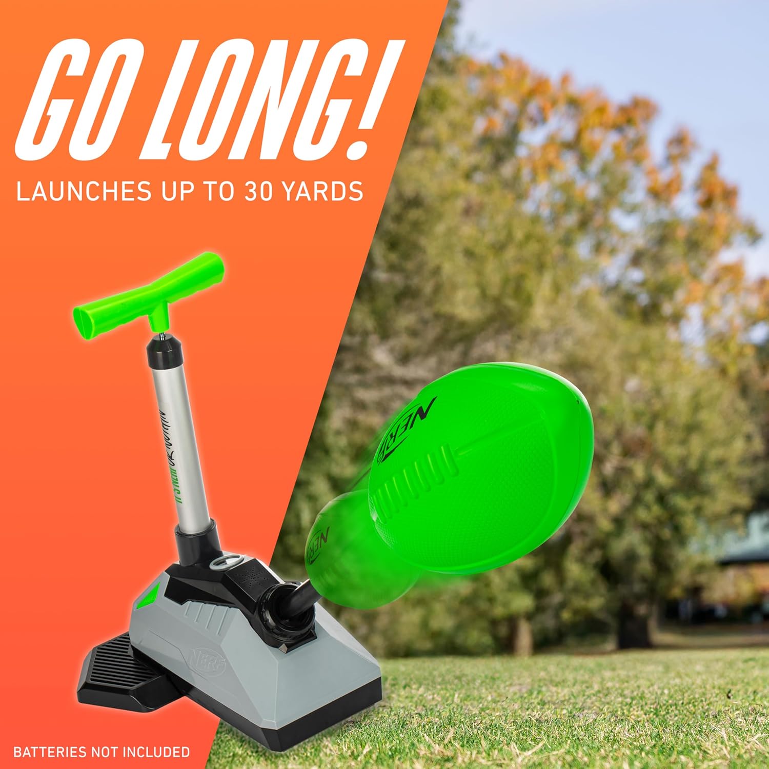 Set, Set, HIKE! Go long with the NERF QB Pro Throw Football Passer! This battery powered kids football launcher throws a NERF mini foam football over 30 yards so kids can practice their route running and catching skills! Select your play, lock the ball, pump it up and then press launch. The NERF QB Pro Throw Football Passer throws a perfect spiral every time, and is the perfect way for youth football players to practice their skills and play fun games with friends in the backyard, at the beach, in the park or anywhere else the game takes you. Play one-on-one, three-on-three or with as many players as you want. Each launcher set comes with a 8.5" NERF foam football included, so kids have everything they need to get the game started. This super fun kids football toy is the perfect gift for any youth football player or fan looking to get in the game. So grab your NERF QB Pro Throw Football Passer and go long today! Requires 4 “AA” batteries (not included). Ages 14+