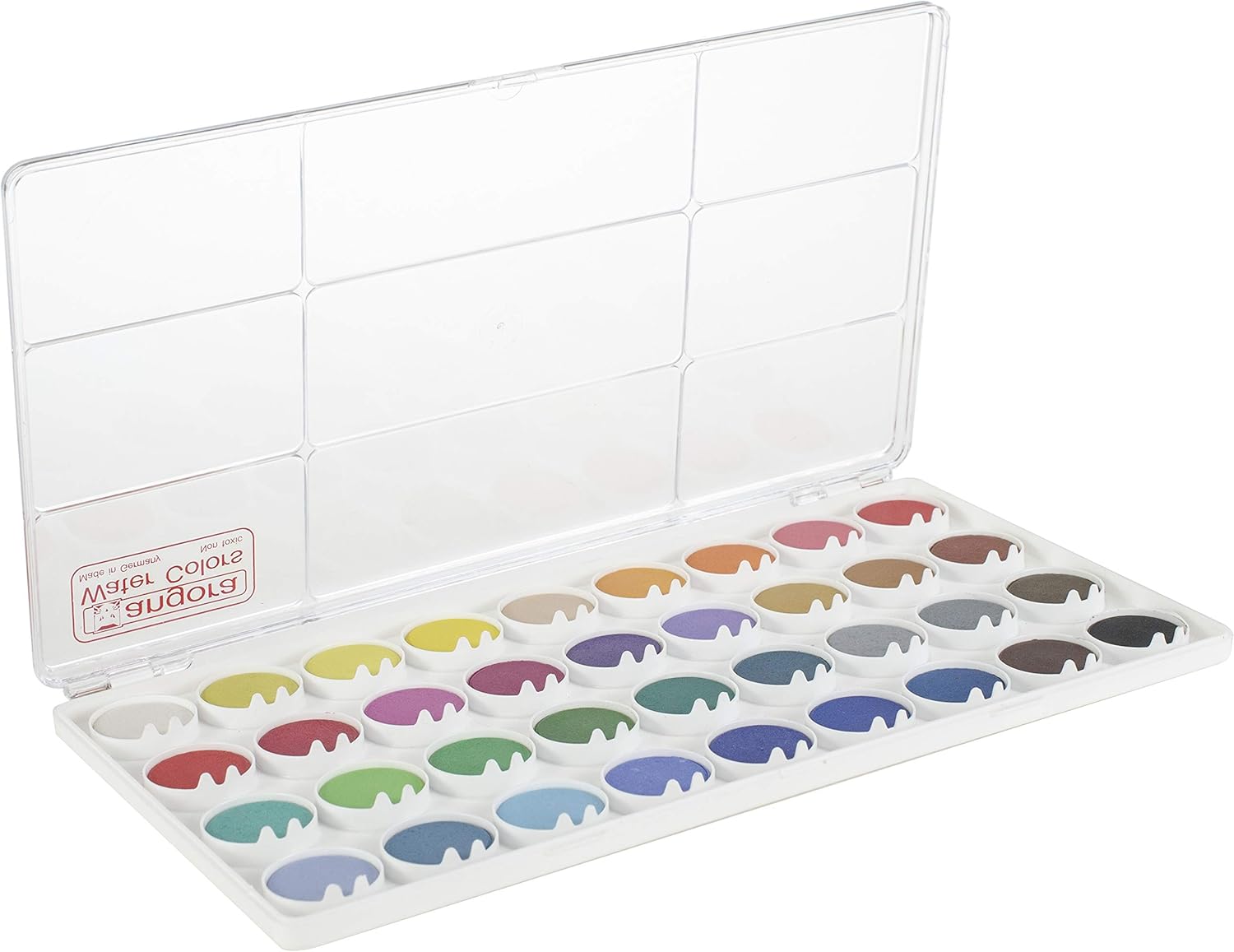 These German-made watercolors are non-toxic; great for any age group. High-quality, thick watercolor cakes are durable and long lasting. This package contains 36 watercolor cakes in assorted colors within one 9.75x5.125x.5 inch case. Non-toxic. Conforms to ASTM D 4236. Imported.