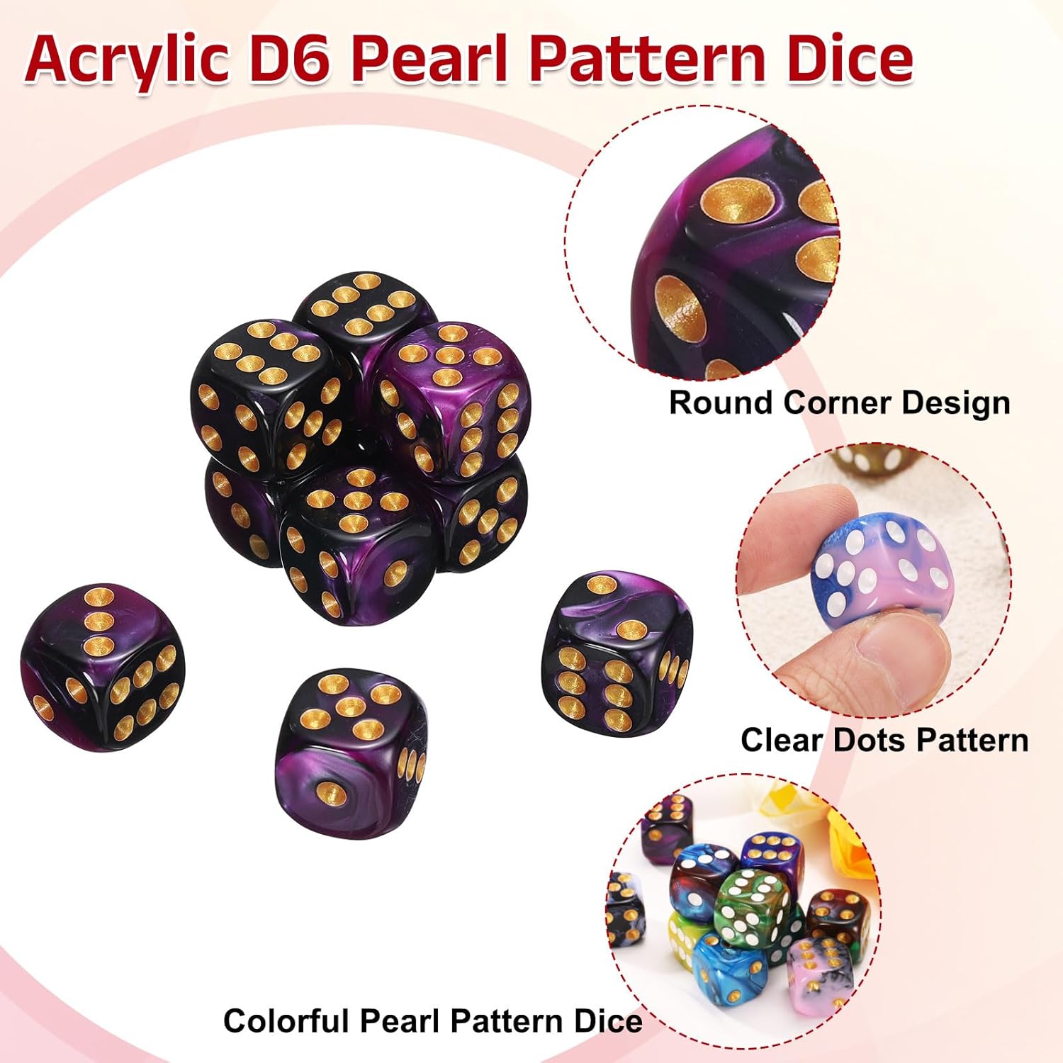 Description: MATERIAL - The six-sided colored dice are made of acrylic with a smooth and polished exterior, they are easy to hold and can roll smoothly. The clear dots pattern is not easy to fade or break after long time use, and it is wear-resistant and waterproof for reuse. Game Activities - Game dice help you decide the results of actions or events during the game, making the game move forward smoothly. EASY TO USE - The board game dice have well-printed dots and painted colors on the surface, making them stand out clearly on each side. Players can quickly see and verify the result of their rolls even from afar, providing a good gaming experience. Wide Application - Polyhedral dice are suitable for classic board games, card games, board games and other similar dice games that require probability calculations. Whether it is for social gatherings, they can bring you an interesting and enjoyable game time. Specifications: Material: Acrylic. Color: Purple And Black Dice With Gold Dots Size: D6 (16 x 16 x 16 mm / 0.63 x 0.63 x 0.63 inches) Package Contents: 10Pcs x 6-Sided Colored Standard Dice