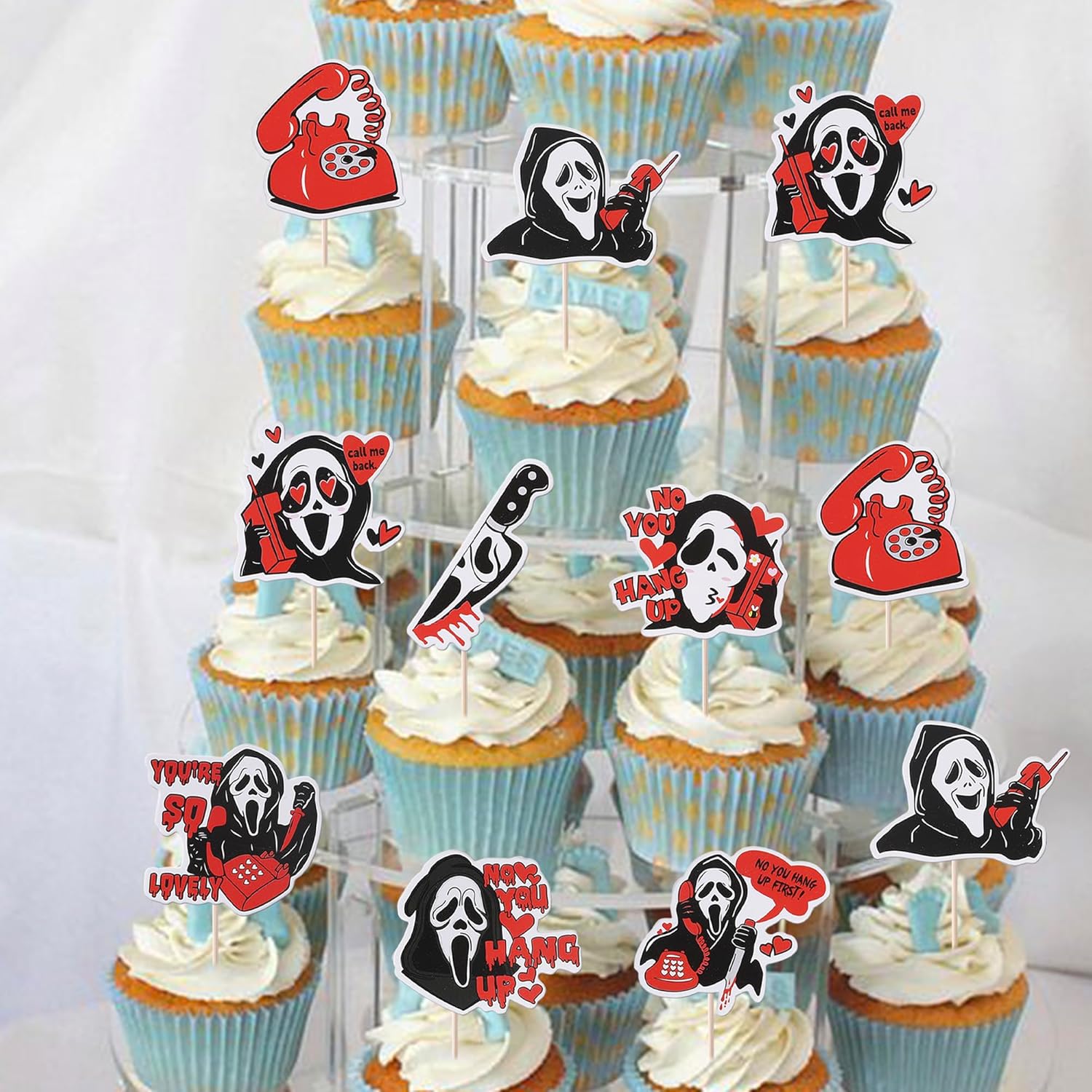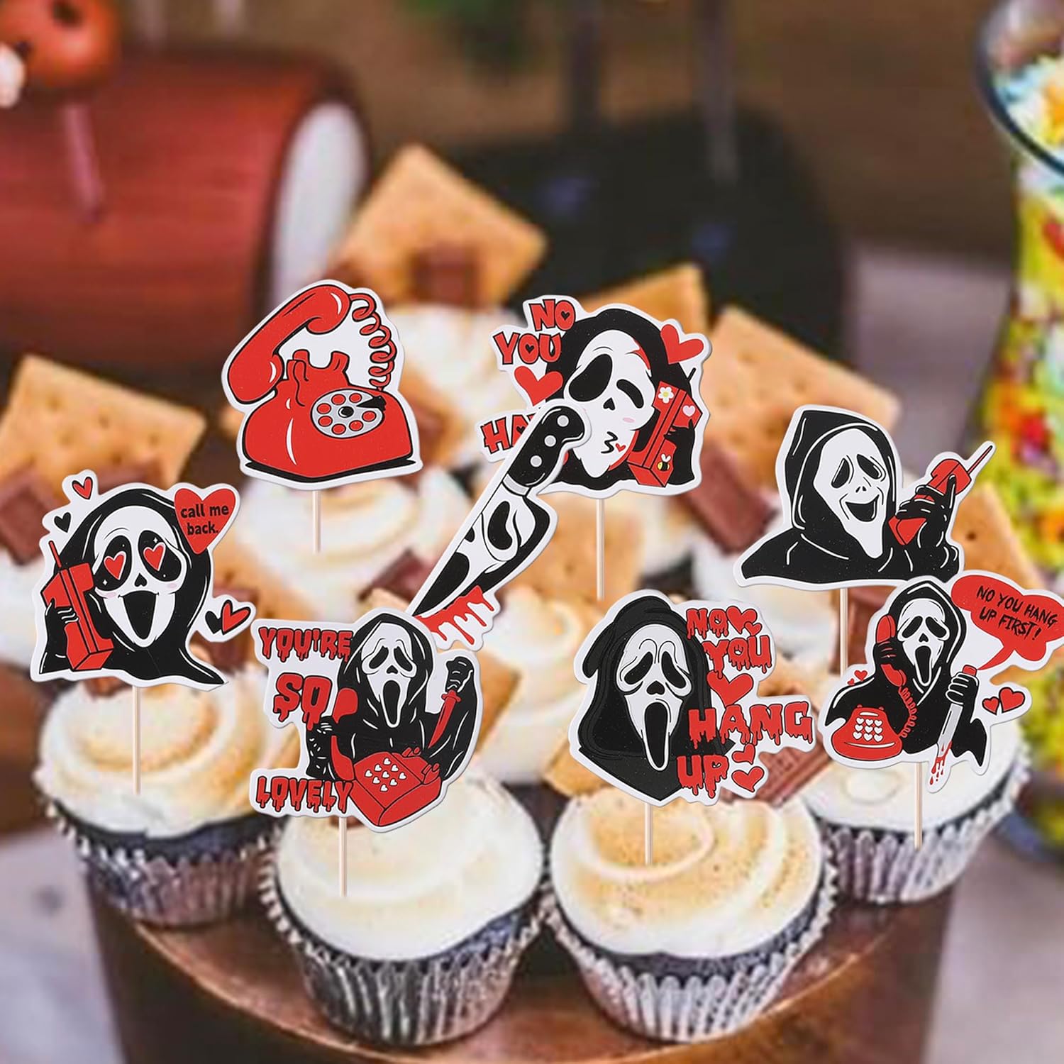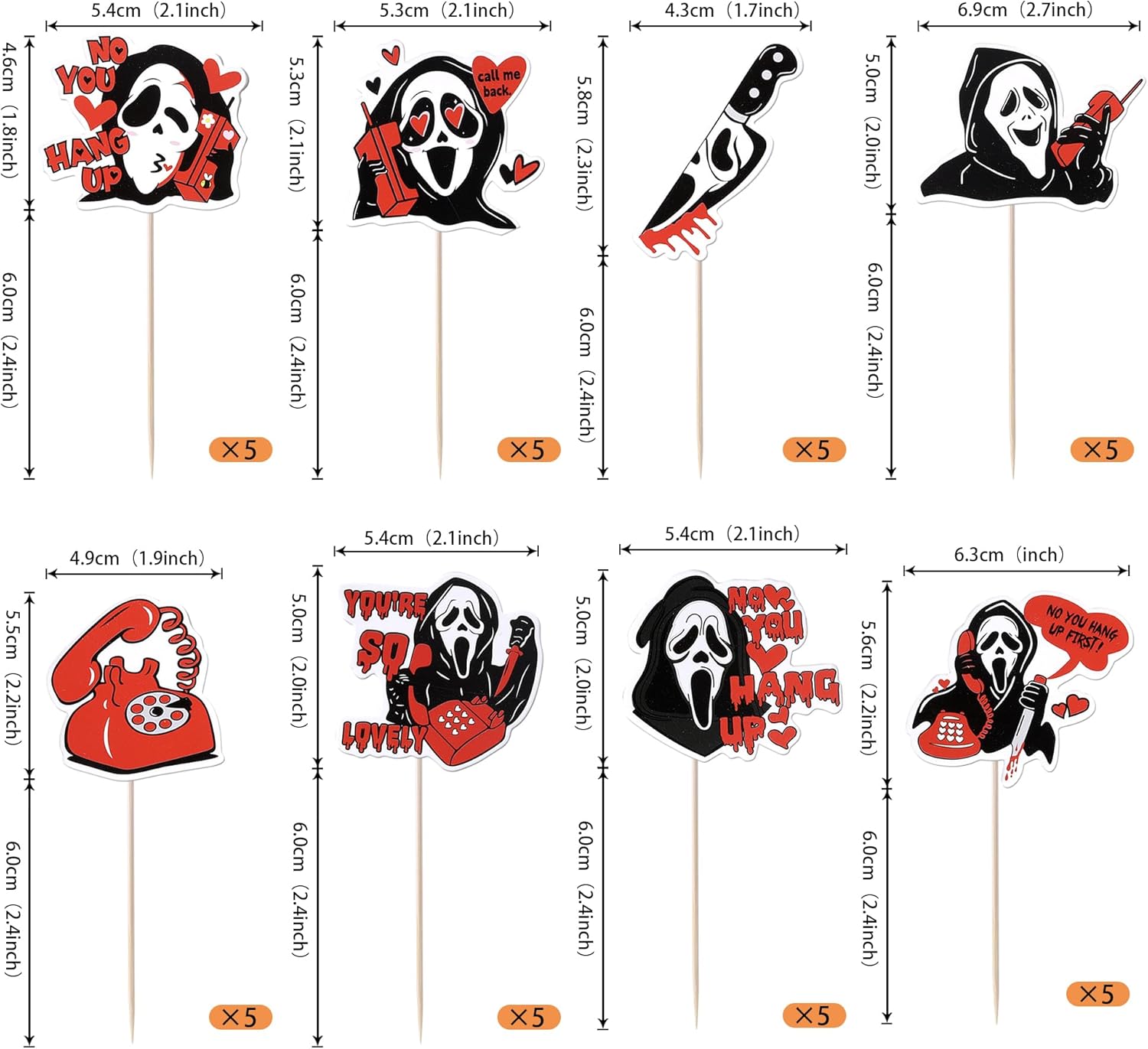 Package and Size Package includes 40 pack horror movie cupcake toppers, all cupcake toppres are assembled well. the size is 2.1*4.2 / 2.1*4.5 / 1.7*4.7 / 2.7*4.4 / 1.9*4.6 / 2.1*4.4 / 2.1*4.4 / 6.3*4.6 inch ( with stick ) Material and Application These horror movie cupcake toppers are made of high-quality 300 gram thick card stock, they are suitable for perfect for horror movie theme party, telephone scam theme party, have a killer birthday theme party, halloween theme party cupcake decorations. which make your cupcake more attractive and interesting. Important Note Due to the light and screen difference, the item's color may be slightly different from the pictures. These cupcake toppers are for decoration purposes only, not edible and do not place in oven or use for baking. These cupcake toppers are double sided printing with patterns on each side. There are only for decoration purposes. Buy with Confidence If you have any question, please feel free to contact us, we will do our best to solve the problem within 24 hours. Rsstarxi is our own brand, which is registered on amazon. The purpose of our brand is make your party attractive and interesting, Our highest priority is your satisfaction!