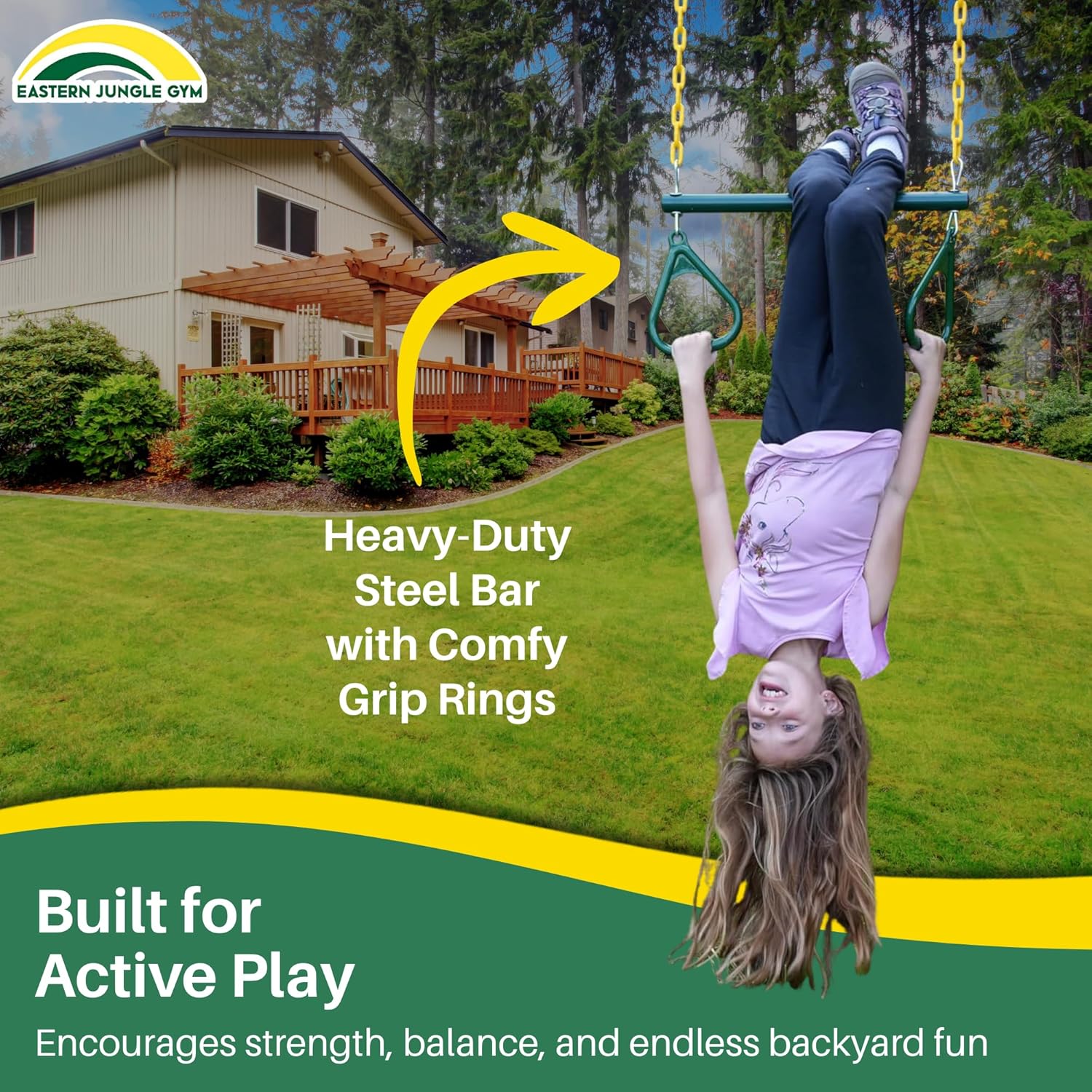Product Description The Ring Trapeze Bar Combo from Eastern Jungle Gym comes completely assembled with two plastisol coated swing chains, trapeze swing bar, and two plastic gymnastic ring handles. A great accessory for the backyard swing set, the trapeze bar swing acts like a mobile gymnastics bar that allows children to build upper body strength and have fun at the same time! Recommended for children ages 3 and up, this swing features a 20” wide plastisol-coated trapeze bar for easy gripping, gym rings with a 5” opening and two 2/0 straight coil, zinc-plated swing chains that are approximately 43” long. The bottom 20” of swing chain is coated in yellow plastisol to allow for soft gripping that is comfortable, secure and pinch-free. From the Manufacturer Gym Ring/Trapeze Bar Combo includes Plastisol coated steel trapeze bar, durable plastic gym rings, and chain. Comes completely assembled.