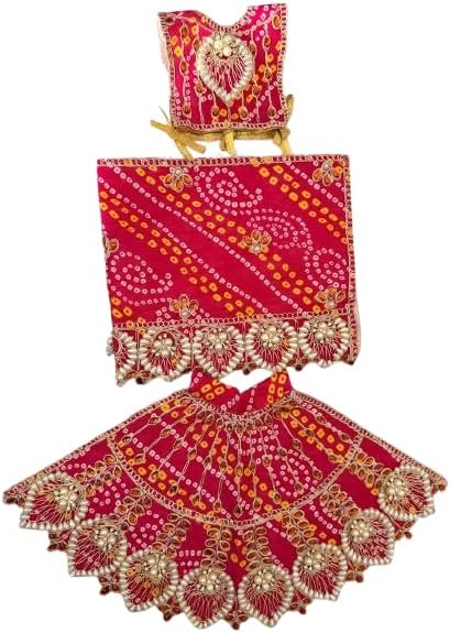This exquisite Durga Maa idol dress set brings divine elegance to your religious celebrations and home décor. The vibrant red ensemble features intricate traditional craftsmanship with stunning embellishments that honour the goddess with beauty and reverence. The set includes a beautifully designed lehenga adorned with traditional bandhani-style patterns in red, yellow, and orange hues, accented with decorative sequins and beadwork. The ornate border showcases elaborate peacock motifs embellished with green and multicoloured stones, creating a regal appearance. The matching patka completes the ensemble, allowing you to dress your deity idol with authenticity and grace. Ideal for 6 or 7 number idols, this poshak is perfect for Navratri festivities, Durga Puja ceremonies, and Diwali decorations. The meticulous detailing and vibrant colour palette make this dress set a captivating addition to your worship space, helping you celebrate with devotion and style. Transform your religious observances into memorable occasions with this designer MATA Rani poshak that combines traditional aesthetics with quality craftsmanship. Generic Brand