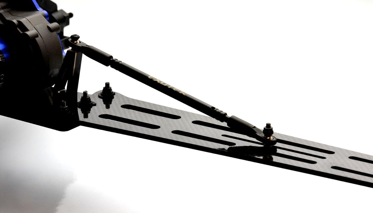 This is the Exotek Drag Slash Pro Single Wheel 3mm Carbon Wheelie Bar Set. This is an updated two hinged design of the popular single wheelie bar concepts. Features an extra long 13.5" from the wheel axle to axle with a 3mm thick carbon fiber wheelie bar with a heavy duty machined titanium turnbuckle that controls the height and angle of the bar and a heavy duty alloy mounting base. The hinge design allows for easier height adjustments and a wide range of tuning and adjustability through the turnbuckle system. Get this awesome wheelie bar and never worry about lack of durability or height tuning and adjustments.