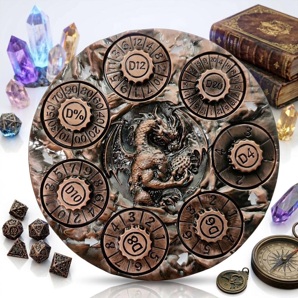 Upgrade Your Tabletop Adventure with the Ultimate 7-in-1 Spinner Dice Coin! Tired of standard polyhedral dice rolling off the table or taking up too much space?Experience the next level of tabletop gaming with our 7-in-1 Rotating Metal Dice Coin. Made from premium zinc alloy with a stunning Chameleon Green finish, this mechanical masterpiece replaces your entire standard 7-piece dice set.Simply spin the corresponding dial—whether you need a quick D4 for a dagger strike or a D20 for a critical skill check—and let fate decide.The center of the coin is adorned with a majestic 3D dragon, adding a touch of fantasy to your gear. Why Choose Our Spinner Dice Coin? All-in-One Convenience: D4, D6, D8, D10, D%, D12, and D20 right at your fingertips. Built to Last: Solid metal construction with an anti-fade coating. Fair Play: Balanced rotation for truly random results. Bring magic to your next campaign and impress your party with this unique gaming artifact!