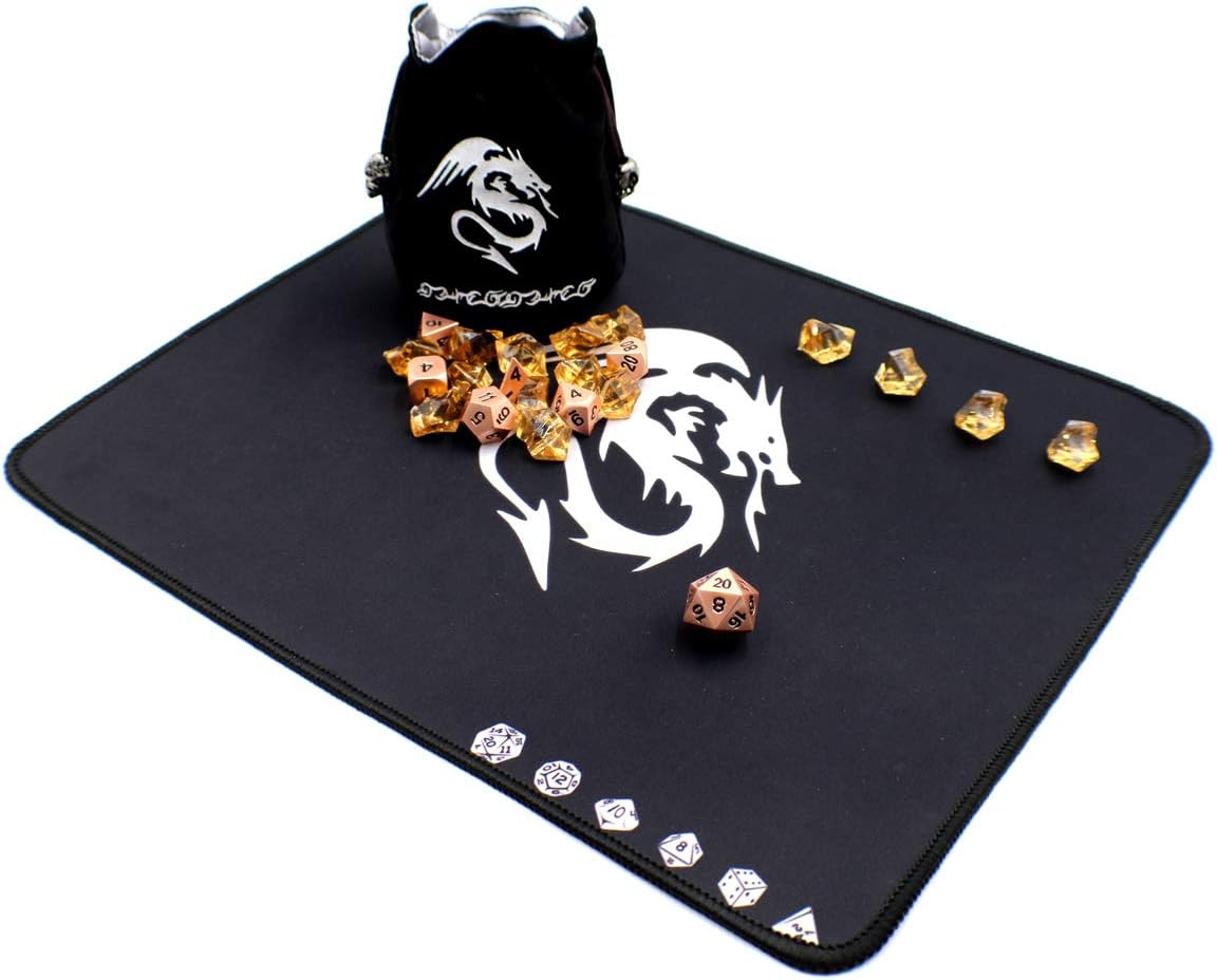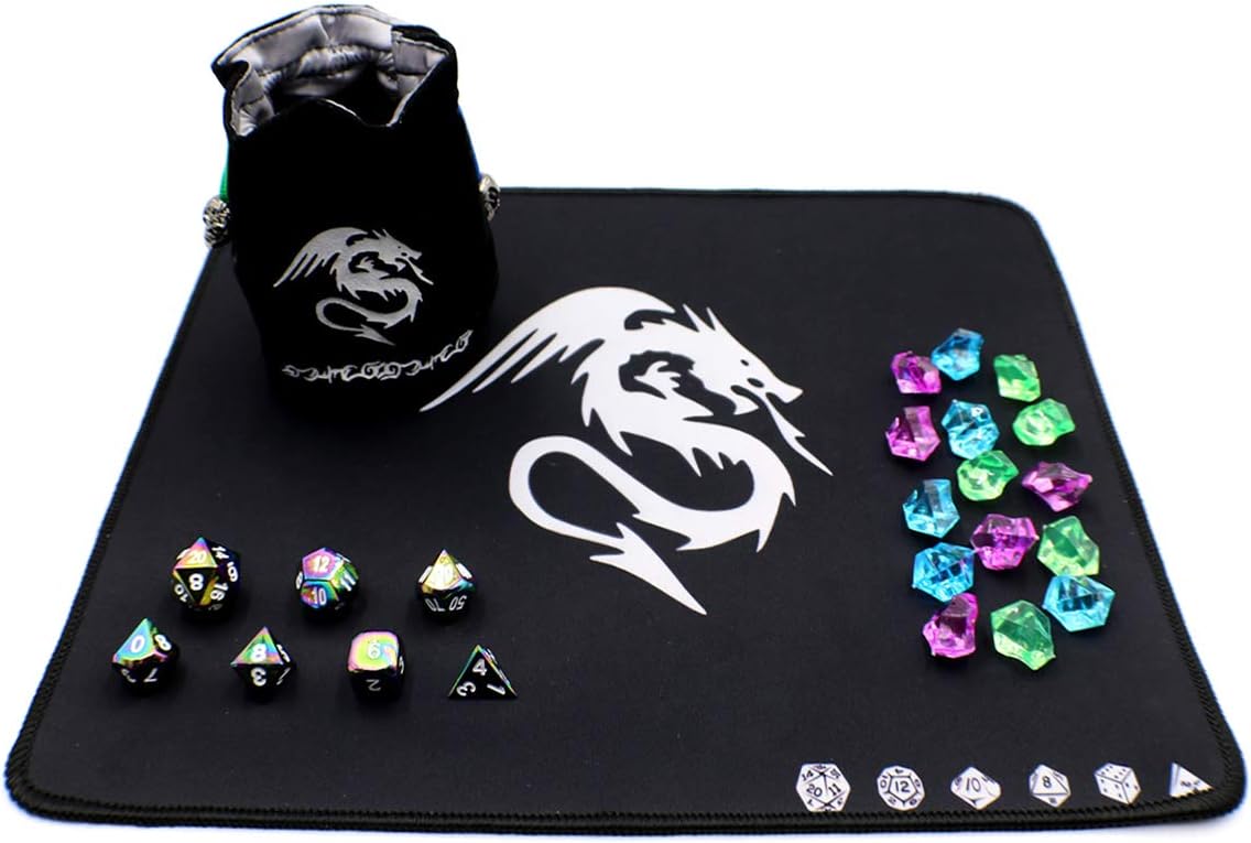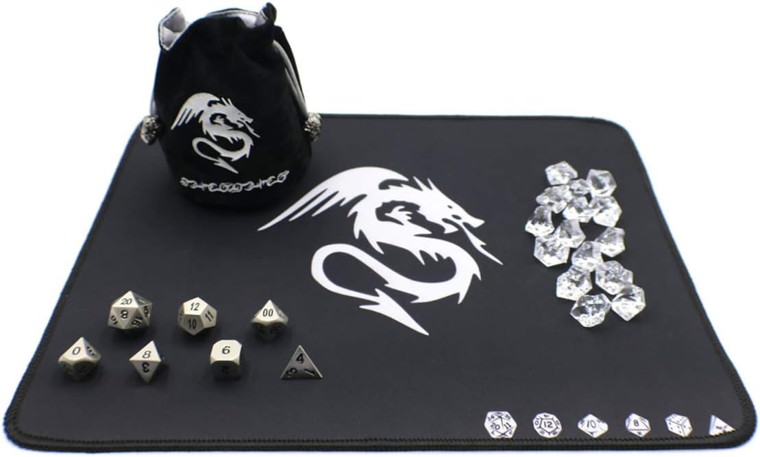 This tabletop gaming set contains some esential items for any avid tabletop gamer. Included in the set are all the items pictured. The dice included are a D20, D12, D10, D8, D6, D4 and a percentage die. This is the typical dice set needed for many role playing and table top games including Dungeons and Dragons.