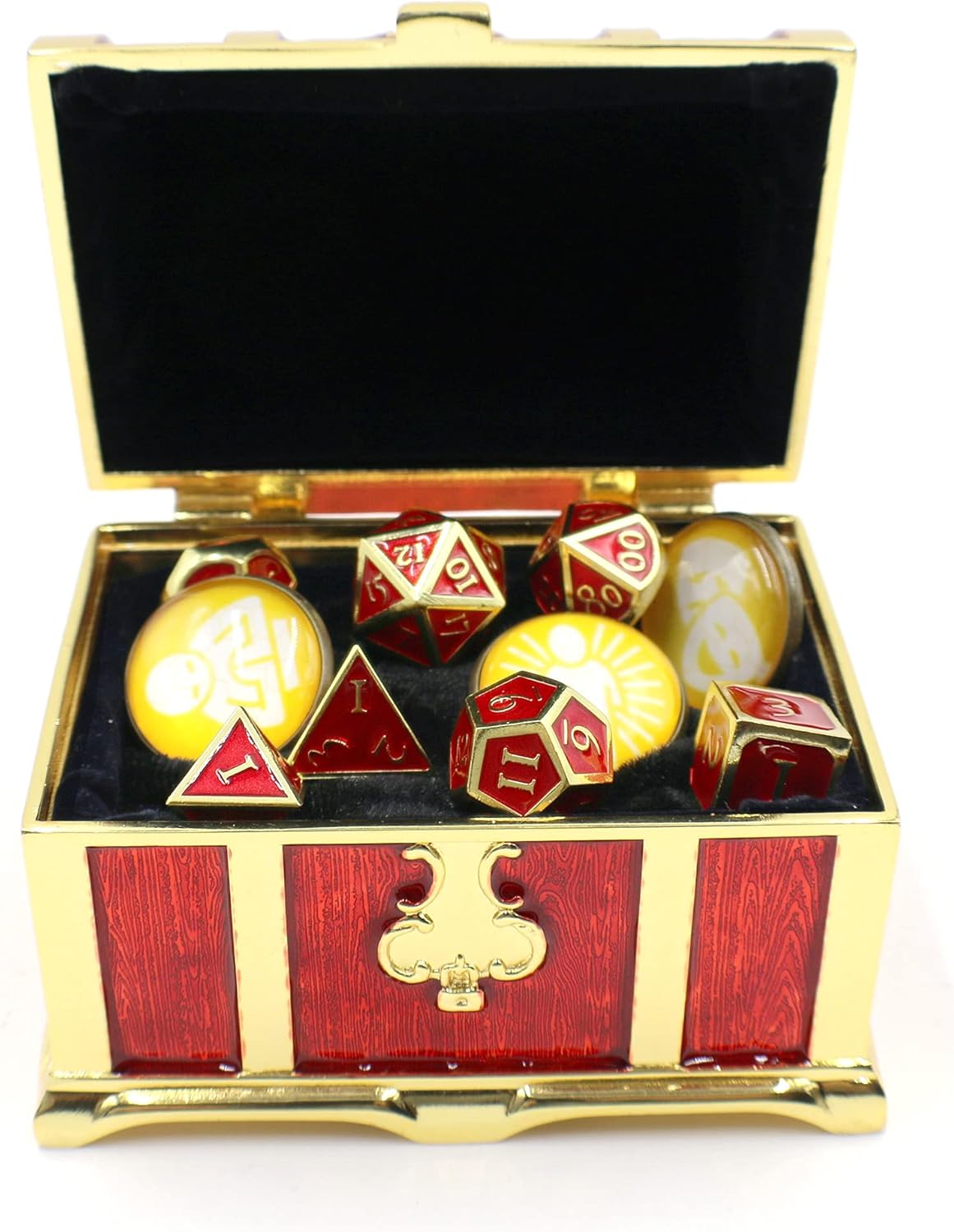 This red and gold treasure chest comes with matching metal dice and 3 glass RPG tokens (for inspiration, bardic inspiration and bless). The dice included are a D20, D12, D10, D8, D6, D4 and a percentage die. This is the typical dice set needed for many role playing and table top games including Dungeons and Dragons.