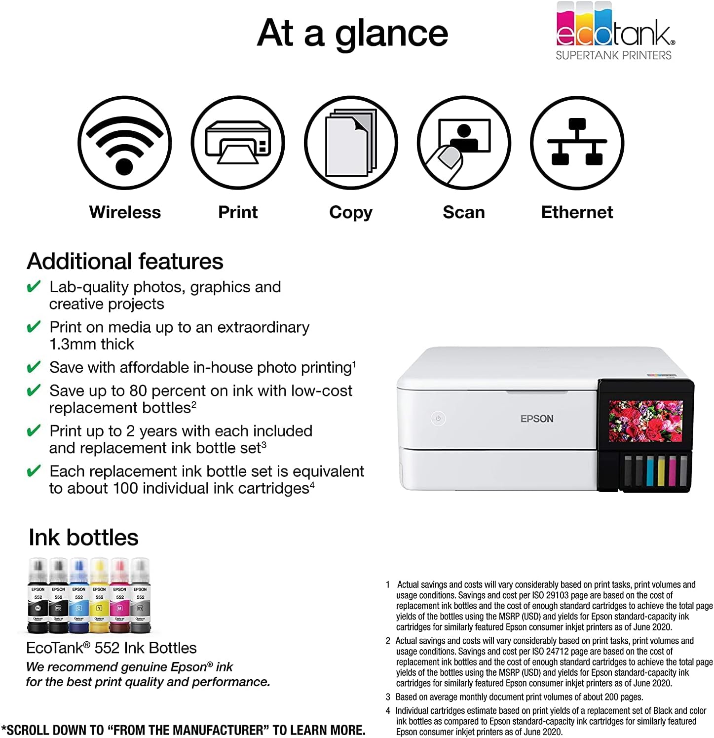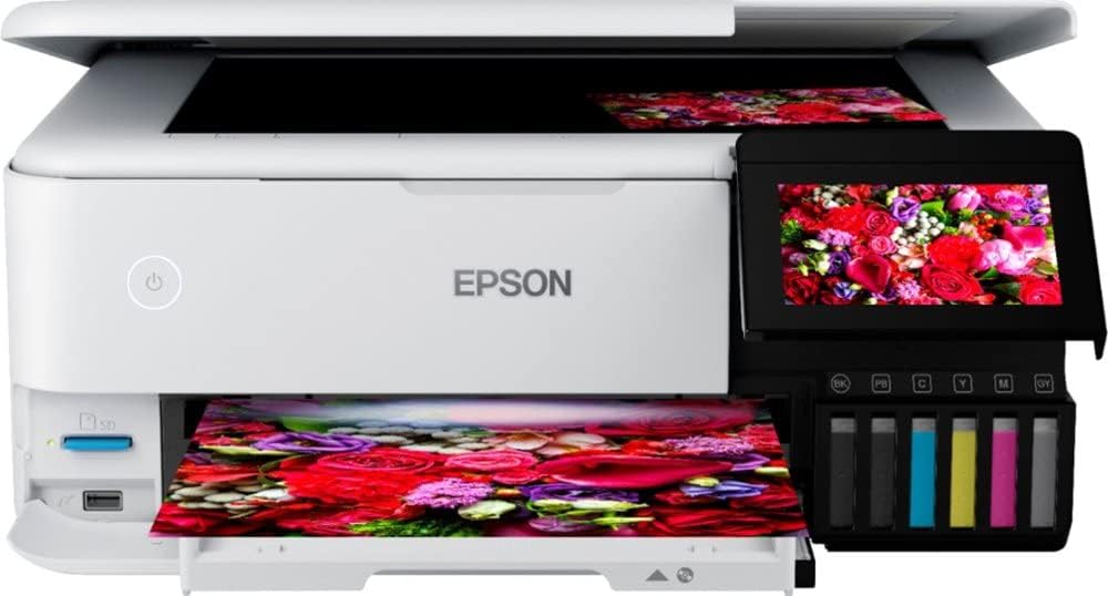 Product Name:EcoTank® Photo ET-8500 Wireless Color All-in-One Supertank PrinterBrand:EpsonDisplay Screen:YesDisplay Screen Size:4.3 inchesModel Number:C11CJ20201Color Category:WhitePrinter Connectivity:Apple AirPrint, Ethernet, Mopria Print Service, USB 2.0, Wi-Fi Direct, OtherAutomatic Document Feeder:NoPhoto Printing:YesAutomatic Two-Sided Printing:YesTray Capacity:100Mobile Device Printing:YesNetworking:WirelessPrinter Type:All In OneISO Color Print Speed:12 pages per minuteISO Mono Print Speed:16 pages per minuteTouch Screen:Yes The EcoTank Photo ET-8500 wireless all-in-one prints lab-quality color photos, graphics and everyday documents — all at an incredible value. Epson’s cartridge-free, 6-color Claria® ET Premium Ink system delivers vibrant colors and sharp text for all your creative projects. With low-cost replacement ink bottles, print 4" x 6" photos for about 4 cents each compared to 40 cents with cartridges1. Print everything from borderless 8.5" x 11" photos to customized CDs/DVDs. You can even print on cardstock and other media up to 1.3 mm thick. For added convenience, each set of bottles lets you print for up to 2 years2. Plus, save up to 80 percent with replacement ink bottles vs. ink cartridges3 — that’s about $2,000 on each set3. The EcoTank Photo lets you do it all with affordable in-house printing.