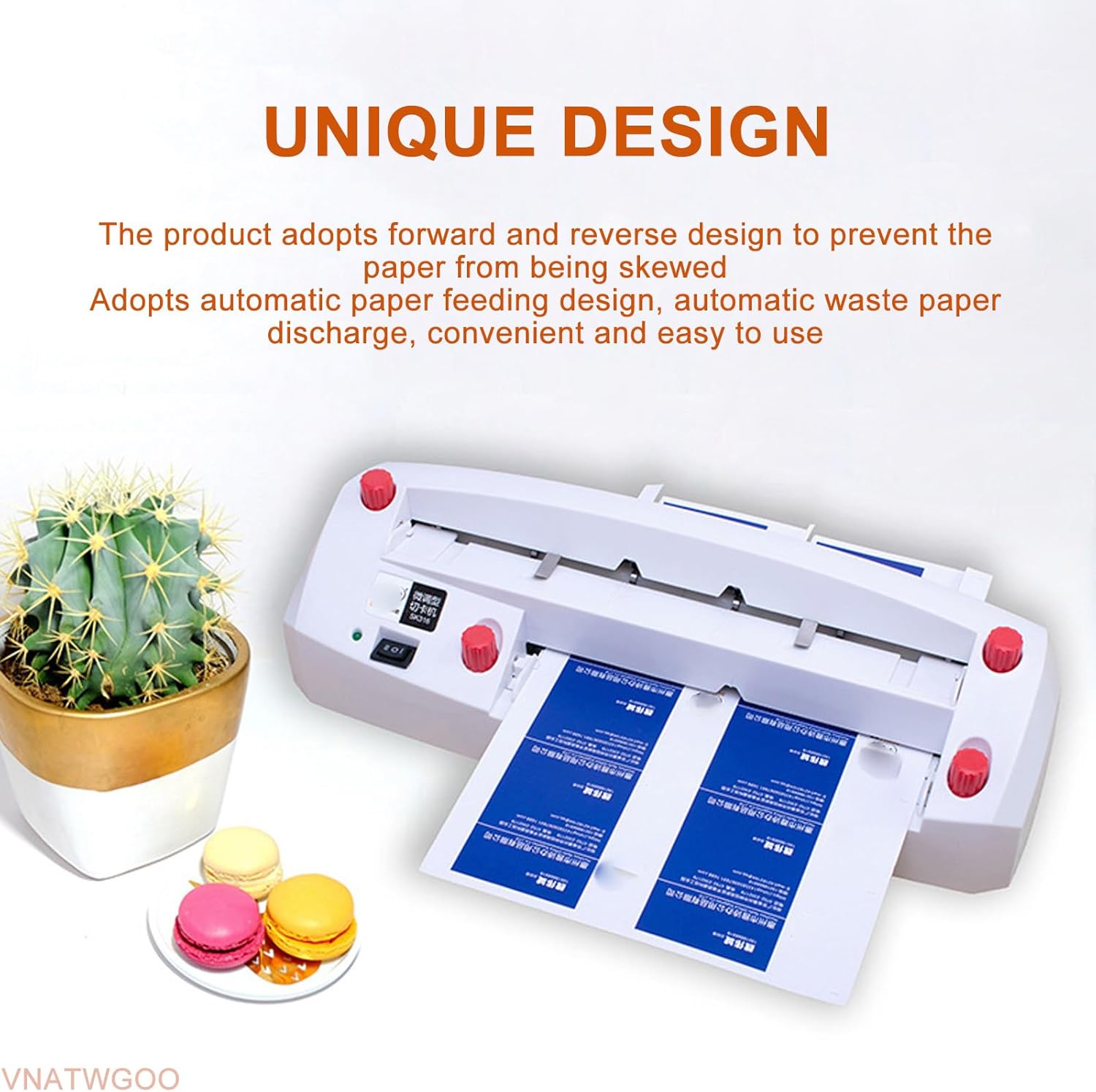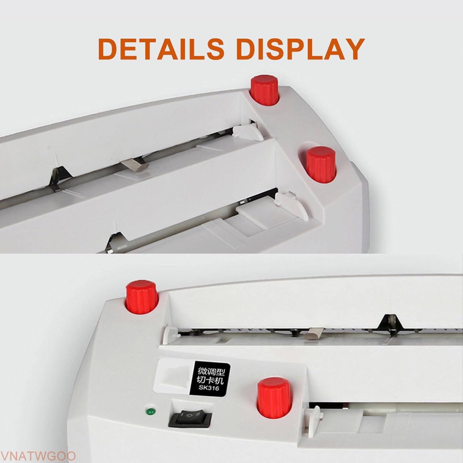 Card cutting machine adopts mechanical and electrical integration design has the characteristics of low power consumption, low noise and fast speed.Suitable for all kinds of printing shops/advertising design shops/small printing factories, etc.Features:The mechanical and electrical integration design has the characteristics of low power consumption, low noise and fast speed9 sets of blade design specificationsAdopts mechanical and electrical integration design has the characteristics of low power consumption, low noise and fast speedAutomatic paper feeding design, automatic waste paper dischargeSpecifications:Product name: fine-tuning business card cutting machineVoltage: 110V/220Vpower: 20WSuitable paper type: (195-212)X297mmSuitable paper thickness: (120-300 grams) except special paperCutting business card specification: 90X54mm square cornerPositioning plate adjustable range: 1-18mmTool life:>100,000 timesCutting speed: 50 rpmProduct net weight: 3.1KGPacking list:Electric card cutter x 1Manual x 1