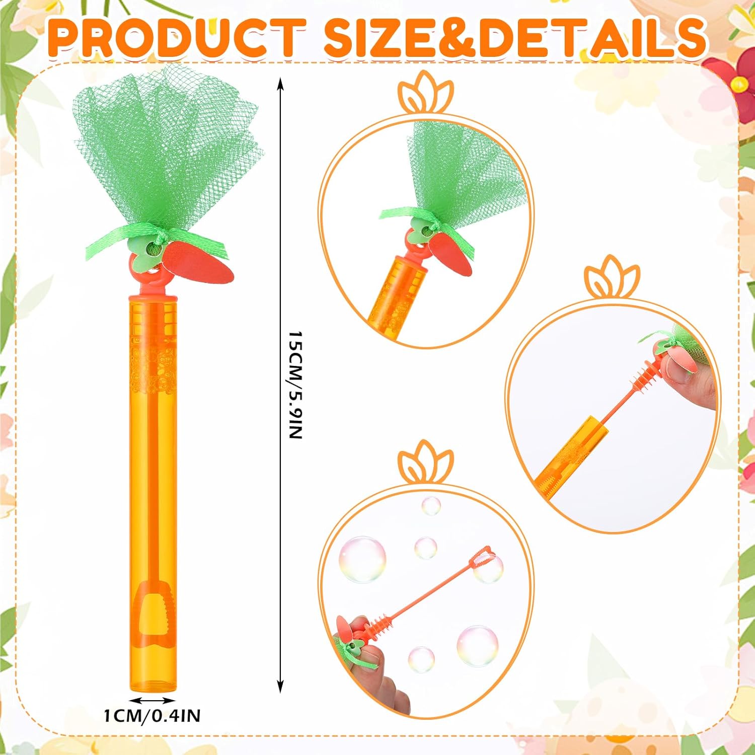 Features: Enhance your Easter festivities with our Easter Bubble Solution in carrot shapes. These mini bubble wands are perfect for little hands. Safe, non-toxic, and portable for endless bubble. Ideal for Easter baskets and party favors! Crafted from realistic carrot-inspired designs, these non-toxic bubbles are safe for skin and clothes. At 4.2 inches/ 10.67 cm, they fit easily into pockets or gift bags, making them perfect Easter gifts. Specifications: Material: plastic Color: green, orange Size: Carrot bubble wands: approx. 4.2 inches/ 10.67 cm Card: approx. 0.98 x 0.98 inch/ 2.5 x 2.5 cm Package includes: 24 x Carrot bubble wands 24 x Cards Notes: Manual measurement, please allow slight errors on size. The color may exist a slight difference due to different screen displays