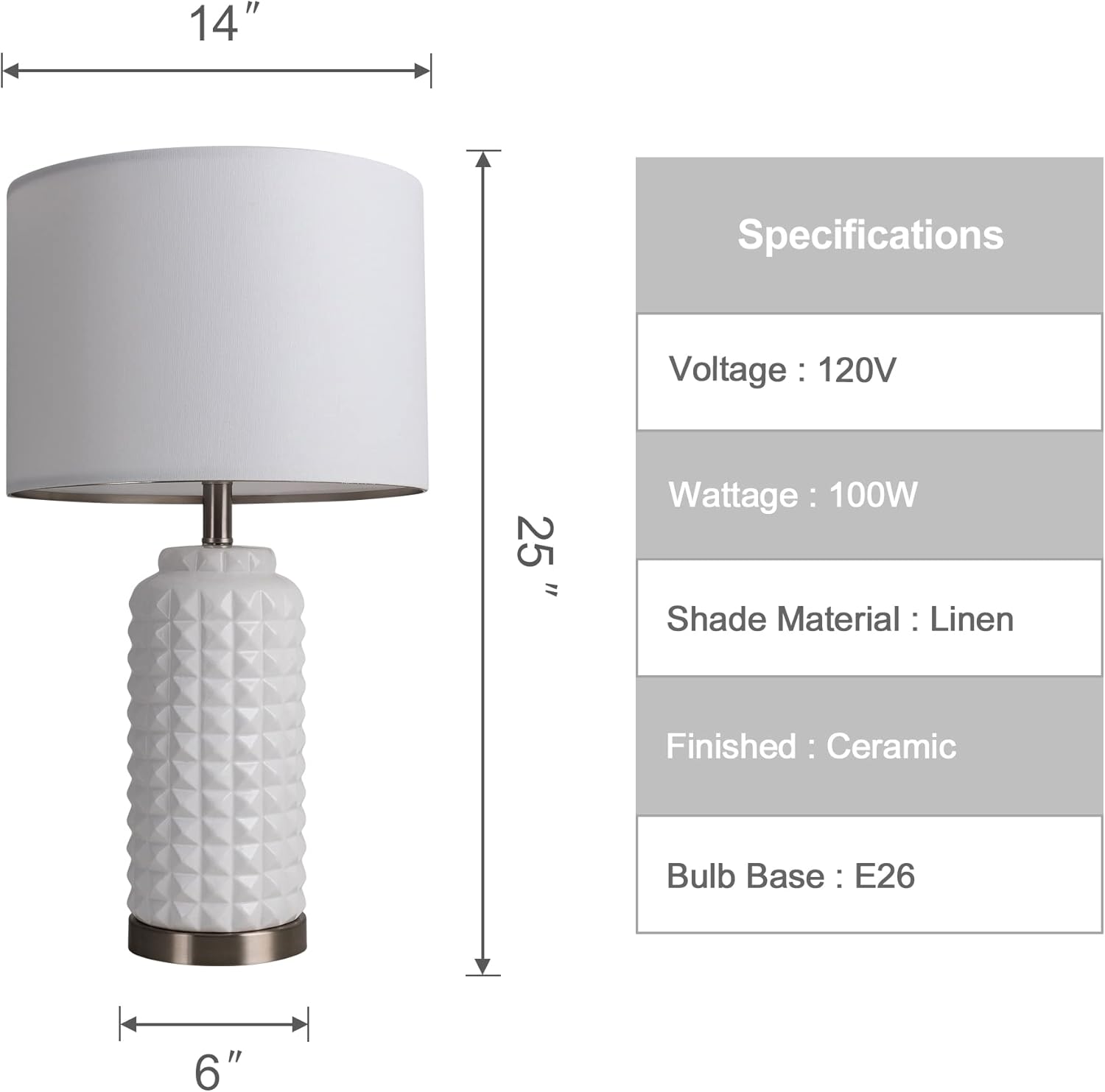 Upgrade your living space with this set of 2 modern table lamps, perfect for bedside tables, side tables, or as buffet lamps. The lamps feature a ceramic base with a unique design that showcases elegant simplicity and ensures easy cleaning and long-lasting durability.Each lamp measures 25 inches in height, with a shade diameter of 14 inches and a base diameter of 6 inches. The lamps weigh 5.80 lbs each and come with a cord length of 59.45 inches, providing ample flexibility for placement in any room, including kids' nurseries.The linen fabric lampshade not only provides bright and soft lighting but also makes the lamp more exquisite. The lamps are UL certified for safety, ensuring that they have undergone rigorous testing and meet the highest standards. The lamps are compatible with E26 bulbs up to 100 watts (bulbs not included), providing flexibility and energy-efficient options for your lighting needs.The set of 2 table lamps is easy to assemble and comes with everything you need. The package dimensions are 15.28 x 9.45 x 20.08 inches, with a package weight of 13.97 lbs.Add a classic touch to your decor with these stylish and sturdy bedside lamps. Upgrade your kids' nurseries, side tables, or buffets with the warm and inviting atmosphere created by these lamps.