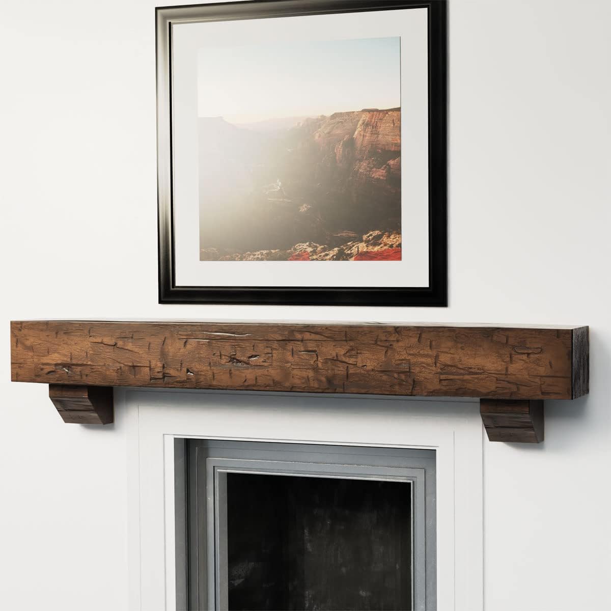 This 4 H x 4 D x 36 W Hand Hewn Faux Wood Fireplace Mantel Kit by Ekena Millwork features Breckinridge corbels and is made of high-density polyurethane, providing durability and no maintenance. The mantel has authentic realistic wood textures and is prefinished in hand-painted designer finishes. It can be used as a floating shelf and is easy to install with included instructions. The corbels are shipped unattached and can be displayed or not, as desired. The mantel is available in multiple widths, depths, and heights, and can be selected unfinished or in a beautiful finish to complement existing decor. The product weighs 10.83 pounds and is compatible with fireplaces up to 7 feet. It is a lightweight, easy-to-install, versatile piece that can be used as functional art or a floating shelf.