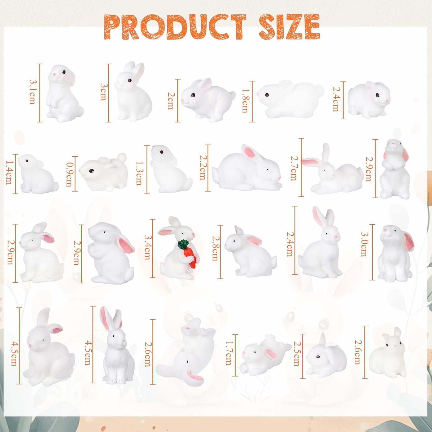 Features: Creativity Boosting Designs: Each mini rabbits figurine features a different posture, embodying a special charm and character. This myriad of cute and chic bunny themed accessories is something that can excite creativity and brighten anyone's day. Part of Your Celebration: These Easter bunny figurines can be crafted to DIY your own custom fairy house diorama. By adding these accessories, you're making a festive collection that celebrates Easter in a stylish and personal way. Get creative and craft your own miniature world. Specifications: Material: resin Main Color: white Size: heights ranging from 0.9 cm/ 0.35 inch to 4.5 cm/ 1.77 inch Package includes: 50 x Mini rabbits Notes: Manual measurement, please allow slight errors on size. The color may exist a slight difference due to different screen displays.