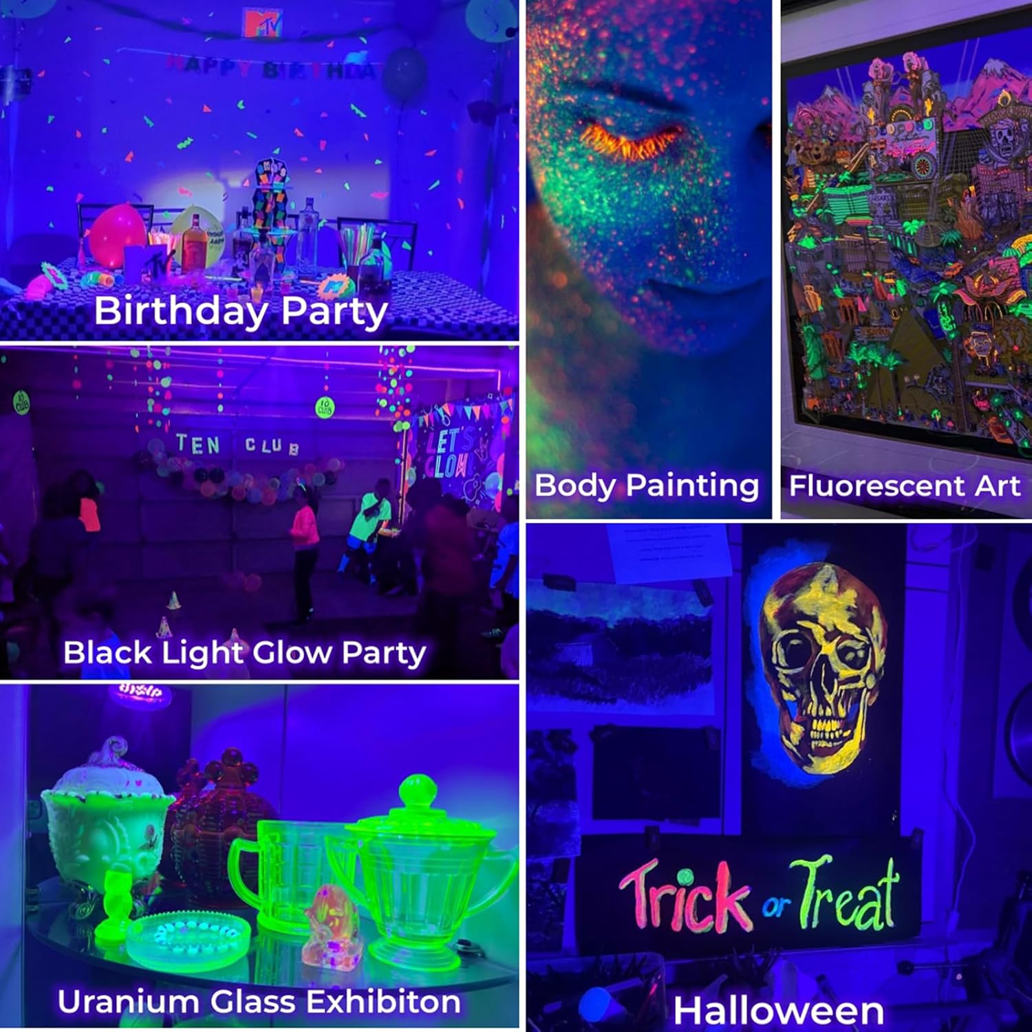 | Specific Uses For Product | Indoor use,Outdoor use,Halloween,Christmas Party,Blacklight Party,Glow in the dark,Glow Party,Fluorescent Art,Body Paint,DJ Dance Party,Holiday Decorations,Birthday, Wedding,Festival,Bedroom Decor,Blacklight Tapestry Posters Decoration,Pub and Club Decoration,Uranium Glass Exhibition,Curio Cabinet Display,Resin Curing,Plants Grow Room,etc. |