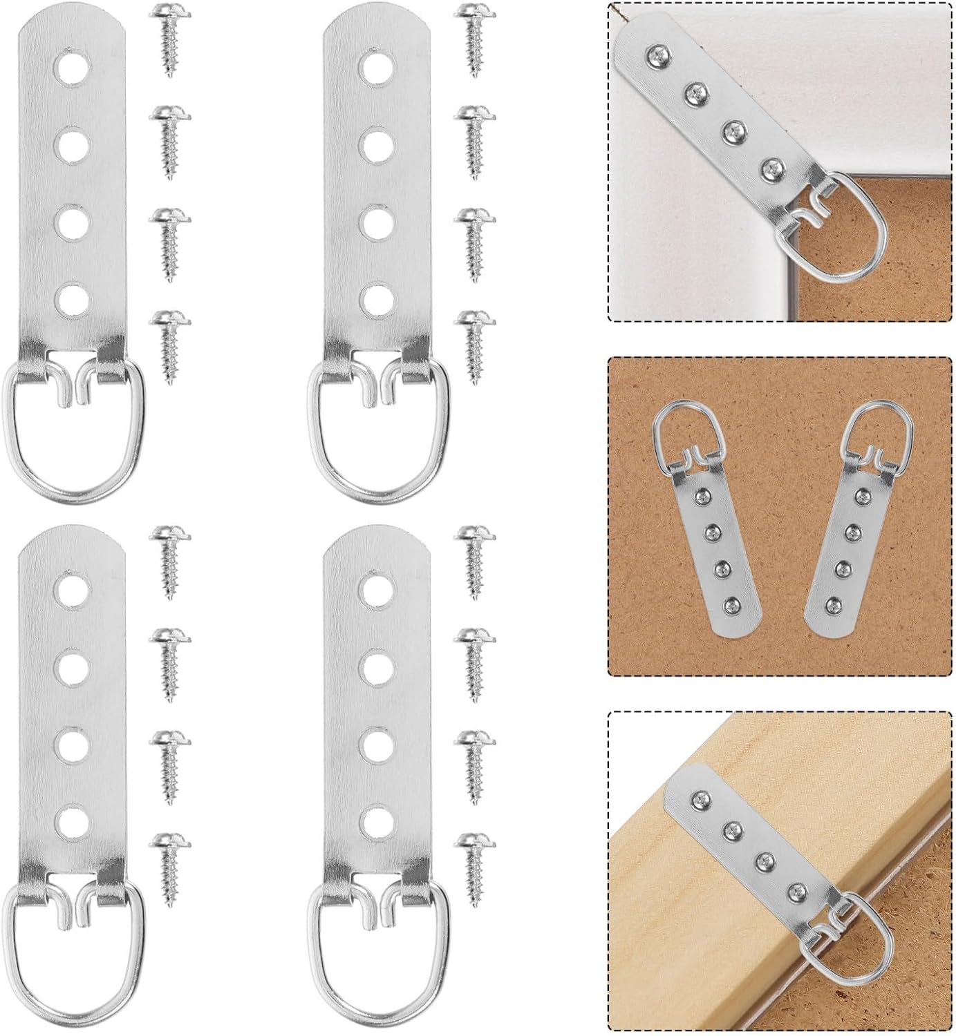 Package List 8 x hanging rings 32 x screws Features -Solid metal: crafted from metal, these d-ring picture hangers allow your frames are securely fastened and stable heavy duty picture hangers -Easy to hang: the ring design allows for a straightforward and secure hanging process screws for hanging pictures -Product Info: Picture frame eyelet screws -Size:7.60X1.70X0.10cm/2.99X0.67X0.04in -Quick and easy installation: lightweight and userfriendly, these accessories can be easily installed on the back of your frames d-ring steel picture hangers -Stylish appearance: with a modern and sleek design, these picture frame eyelet screws enhance the aesthetic of any frame d hooks -Material:Metal -Adaptable use: the photo frame screws are ideal for wooden, plastic, and metal frames, providing a versatile solution for various framing needs picture hanging hardware -Color:SilverGoods Descriptionhanging rope ring buckle The sturdy metal construction and multiple holes provide maximum support and flexibility, making it easy to achieve the ideal alignment.heavy duty d rings These hangers are ideal for both residential and commercial settings, providing performance and a sleek appearance.picture hanger Designed for heavy-duty use, these picture frame hanging rings are ideal for securing large and heavy frames