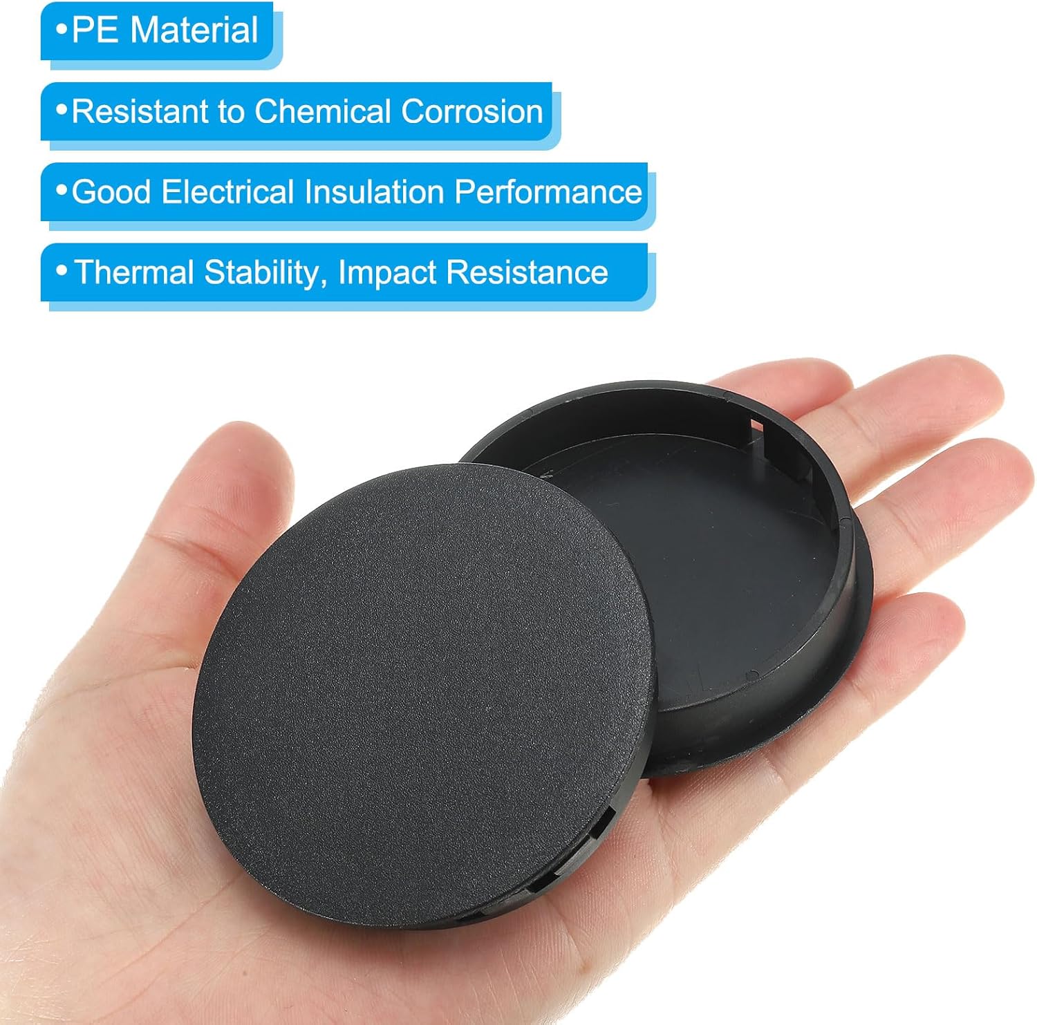 Hole plugs are good for covering, hiding, and decorating holes. They are widely used for steel furniture, tables and chair legs, shelf nail holes, cabinets, brackets, bookshelves, bookcases, closets, bathroom cabinets and other screw holes, partition holes, reserved holes in the cabinet or electric box, outdoor equipment, etc.SpecificationMaterial: PE PlasticColor: BlackHole Diameter: 60mm / 2.4"Size: 64.1 x 11mm / 2.52 x 0.43 inch (Cap Dia.*H)Fit fot the hole diameter: 59-60mm / 2.32-2.36 inchPacking List: 6 x Hole PlugsAdvantagesHole Plugs are made of PE Plastic, waterproof, dust-proof, wear-resistant, sturdy and durable, and not easy to break. Comes with a card tooth design, and is not easy to fall off. Perfect hole plugs for round holes can be applied to cover, hide, and decorate holes.InstructionNo special tools are required, you only need to choose the correct size holes plug according to the diameter and push fit, which is easy to install.Note: Before buying, you must recognize the size of your holes before buying, and measure the trail of the hole.