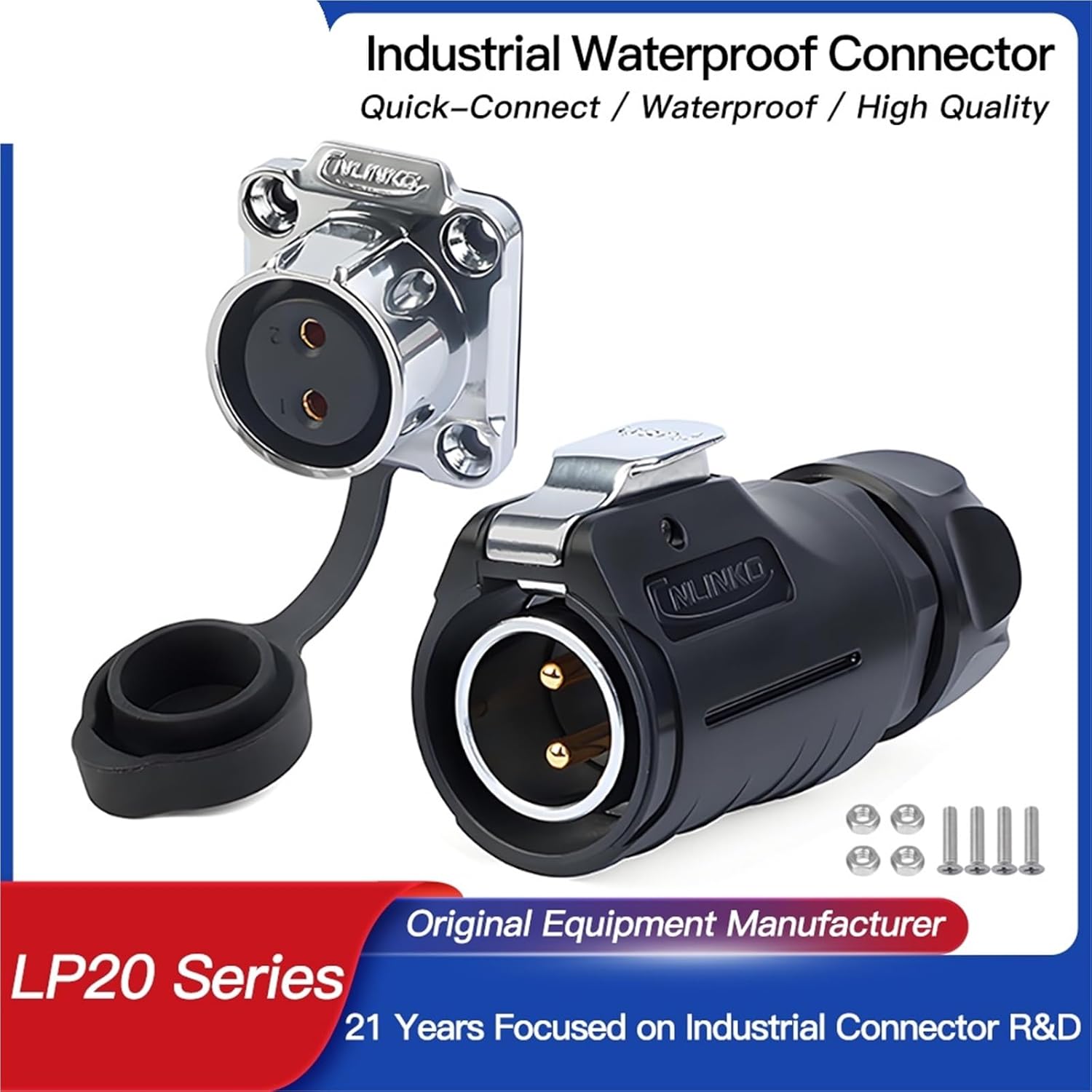 Connectors==========Model Number : LP20Certification : CE,RoHS,UL,weeeCable Specification(2~4pin) : 2.5~4.0mm²/14-12AWGDiameter Range(2~7pin) : 10.0-12mmRated Current : 5A~20AOperating Voltage(AC.V.rms)1 Minute : 250V~500VContact Resistance(Max.) : 1-5m OmegaInsulation Resistance(Min.) : 500M OmegaProtection Level : IP68Working Temperature : -25~+85 Degree CentigredeConnecting Mode : Screw ConnectorSoldering : Easy Locking TypeCable Specification(5~7pin) : 1.0~1.5mm²/18-16AWGCable Specification(9~12pin) : 0.34~0.5mm²/22-20AWGDiameter Range(9~12pin) : 5.0-6.5mmConnector type : Panel connector/inline connector