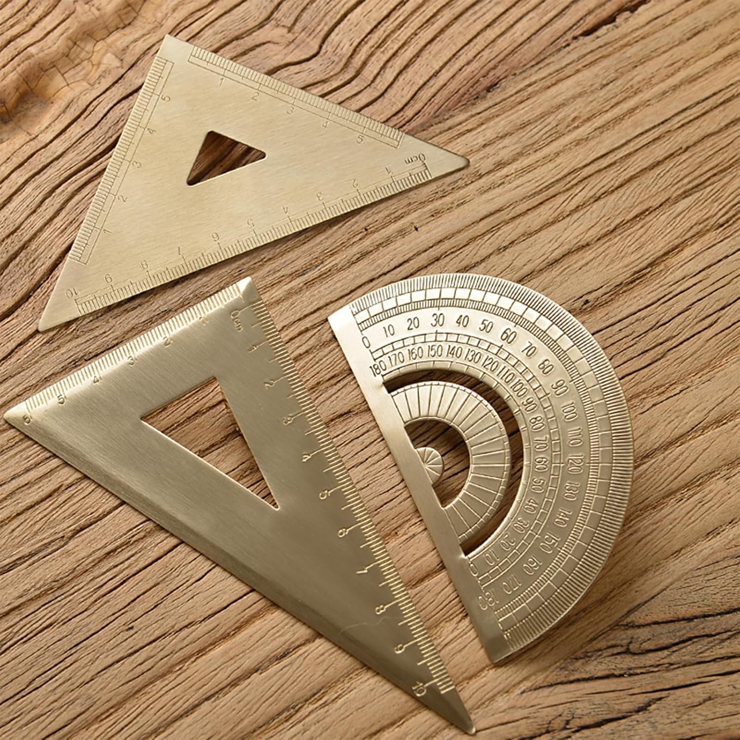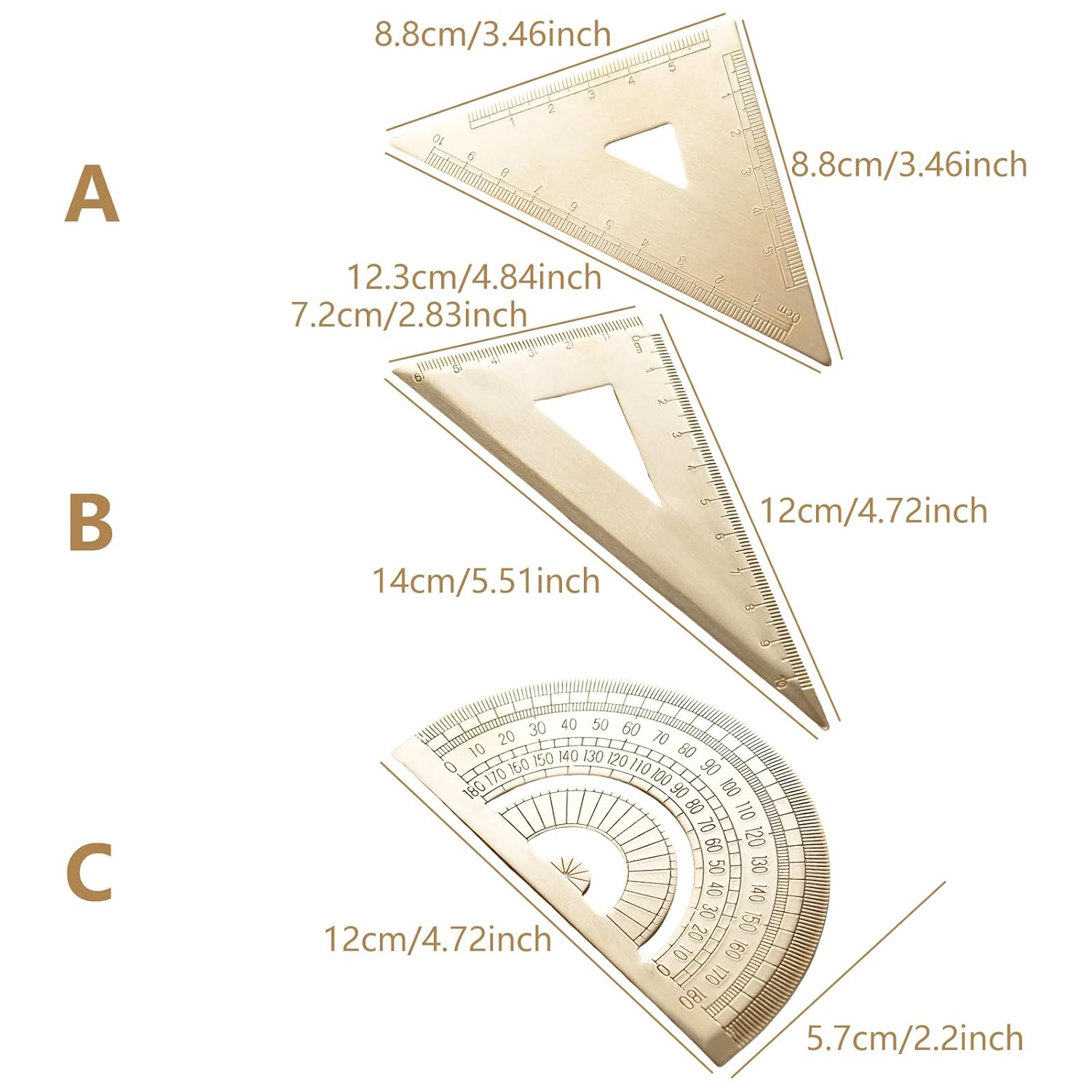 Math Semicircles Protractor Brass Vintage Triangular Ruler Stationery Precisions Measuring Tool Brass Drawing ProtractorFeatures:Help you to improve working efficiency and save time with drawing and measurement projects.Make of brass, safe, enduring, and easy to store.Easy to carry and light weight, you can carry it easily and conveniently in different place. Different kind of gauges to meet various purposes. The scale is clear and easy to read.The golden metal appearance is very distinctive and well make. And It will be necessary tool in school or office.Specifications:Component: Brassstyles: 45 Triangular Ruler/Triangular Ruler/Semicircles Protractor45 Triangular Ruler Size: about 8.8x8.8x12.3cm/3.46x3.46x4.84inchTriangular Ruler Size: about 7.2x12x14cm/2.83x4.72x5.51inchSemicircles Protractor Size: about 12x5.70cm/4.72x2.24inchPackage Includes:1Pc Brass RulerNote:Please allow 1-2cm errors due to manual measurement, make surely that you not mind before order. Due to difference between different monitors, the picture may not reflect the actual color.