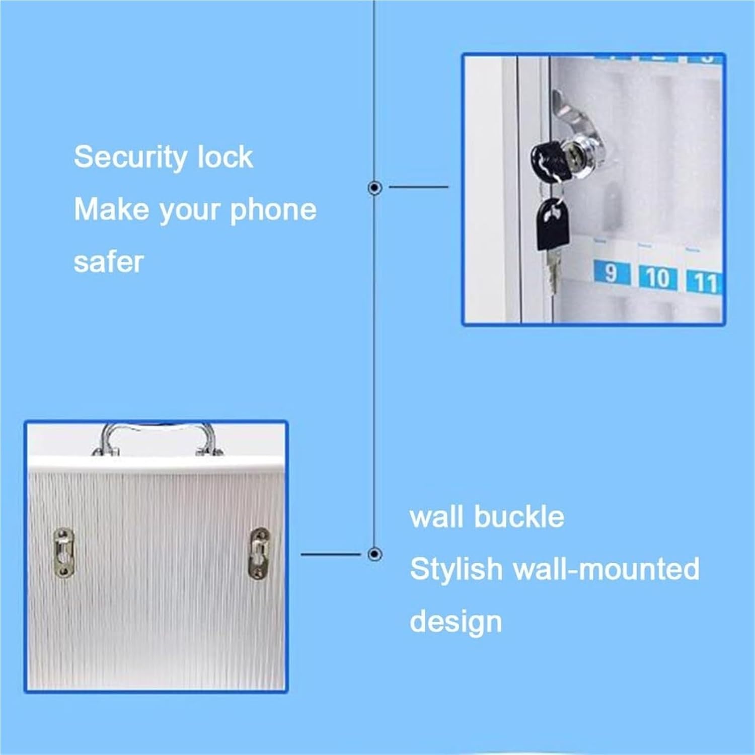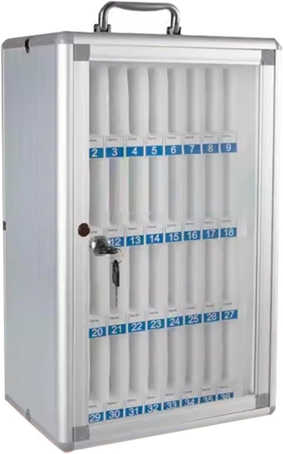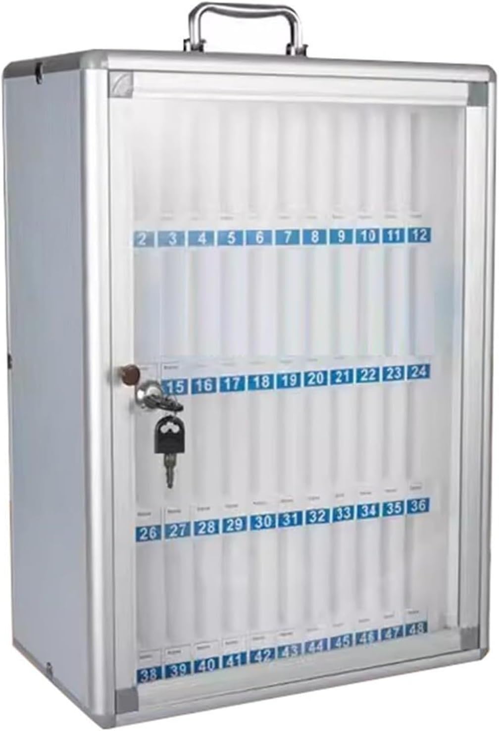 Cell Phones Storage Cabinet 12/24/36/48/60 Slots Aluminum Alloy Cell Phone Lockers Wall Mount and Desk Phone Locker with Multiple Slots Lockable Secure Smartphone Holder for Office Classroom Home Use. Great for storing student mobile phones, small calculators or other small items. Size: 6 bits:21*14*21cm/8.2*5.5*8.2in 12 bits: 22*19*29cm/8.6*7.4*11.4in 24 bits: 26*19*39cm/10.2*7.4*15.3in 36 bits: 28*19*51cm/11*7.4*20in 48 bits: 36*19*51cm/14.1*7.4*20in 60 bits: 36*19*62cm/14.1*7.4*24.4in Color: Silver Material: aluminum alloy