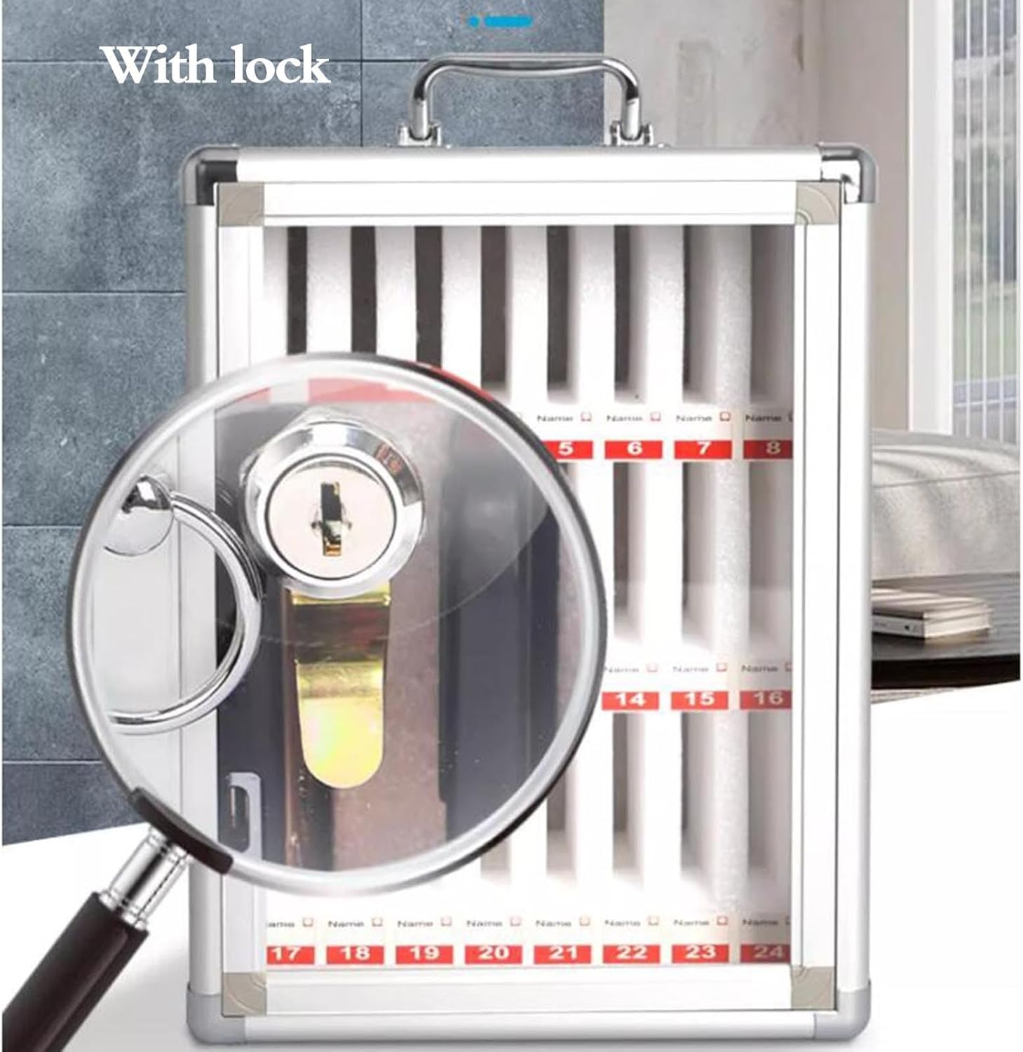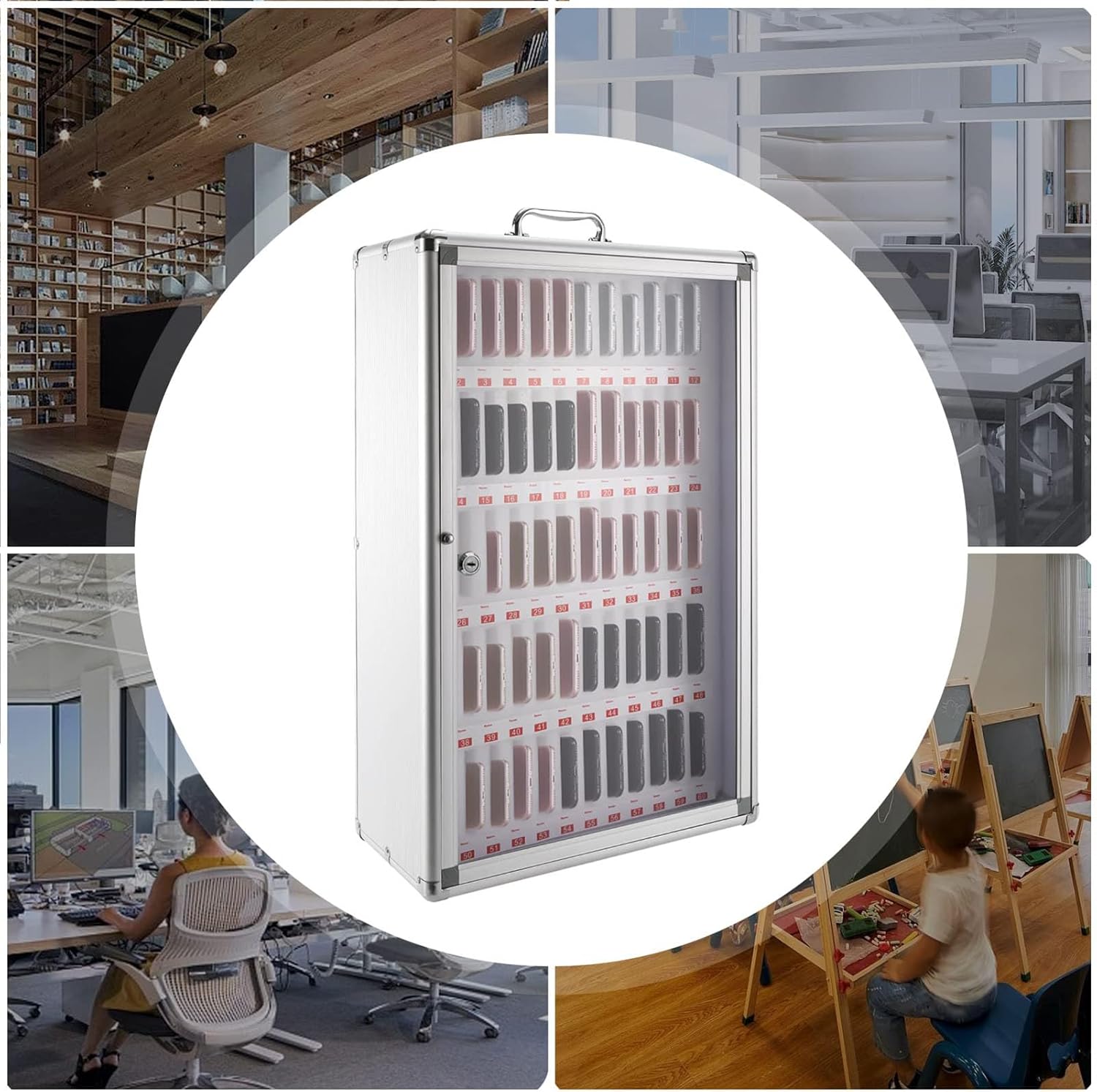 Wall-Mounted Cell Phone Storage Cabinet with Locks for Classroom, Office & Gym - Secure & DurableProduct Specifications:Color: SilverPlacement: Wall-mounted, DesktopFrame and Lock Material: Aluminum AlloyShell Material: Painted MDFPanel Material: Transparent AcrylicCorner Material: Stainless SteelCompartments Material: Pearl CottonPhone Compartment Size: 9*1.5cmProduct Features:Equipped with a sturdy lock and keys, this cell phone storage cabinet ensures your devices are safely stored and protected from theftThe transparent acrylic door panel allows you to easily see the stored cell phones, while the pull ring makes opening the door convenientThe inner pearl cotton compartments provide excellent shock absorption, keeping cell phones stable and reducing damage from collisionsWith a shiny silver-plated handle and lightweight design, the cabinet can be easily moved and carriedSuitable for schools, classrooms, offices, gyms, restaurants, libraries, and more, this cabinet is perfect for storing cell phones or small valuablesPackage Included:1* Cell Phone Storage Cabinet2* Keys1* LabelNotes:This cell phone storage cabinet is designed for environments where organized and secure storage is essential. It can be mounted on the wall or placed on a desktop
