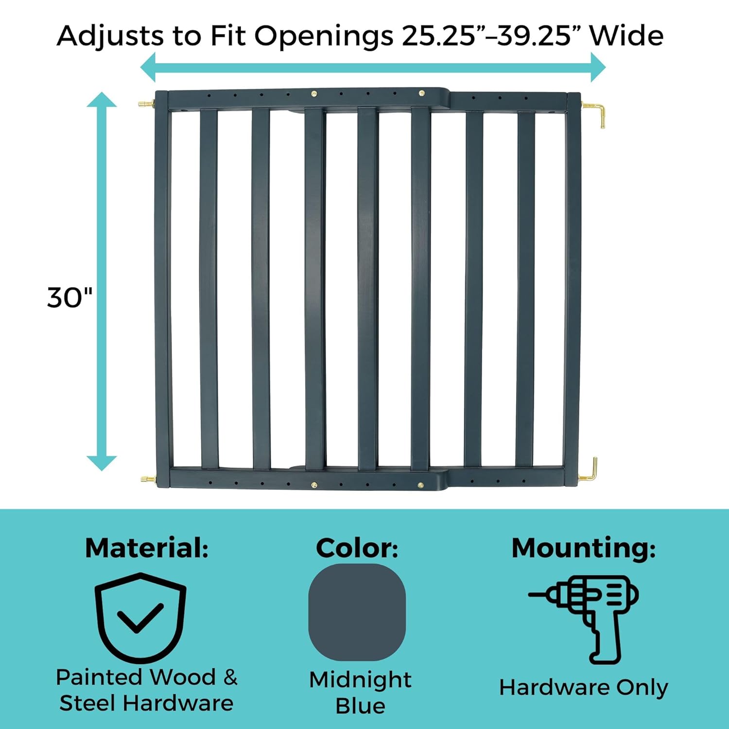Safety has never looked so stylish with the Toddleroo LuxeCraft Wood Gate Collection. This modern wood baby gate pairs sleek lines and upscale gold hardware with bold, on-trend finishes making it a statement piece as much as a safety essential. The bold Midnight Blue finish of this LuxeCraft gate adds a touch of sophistication to your home. Designed to complement contemporary interiors, this wooden baby gate fits openings 25.25”–39.25” wide and stands 30” tall, offering versatile coverage for doorways, hallways, and stairways. Hardware-mounted for maximum stability and certified by the Baby Safety Alliance, this wooden baby gate for stairs provides the dependable security parents need without sacrificing style. With its one-hand operation, no-threshold baby gate design to prevent tripping, and swing control feature to guide the direction of the door, this gate blends modern sophistication with everyday practicality, beautifully protecting your home and your little one. Proudly based in the USA, Toddleroo by North States has been helping families create safer spaces since 1953. Our gates are designed by skilled American workers and built to meet high standards for safety, durability, and ease of use—because parents deserve products they can trust every day.