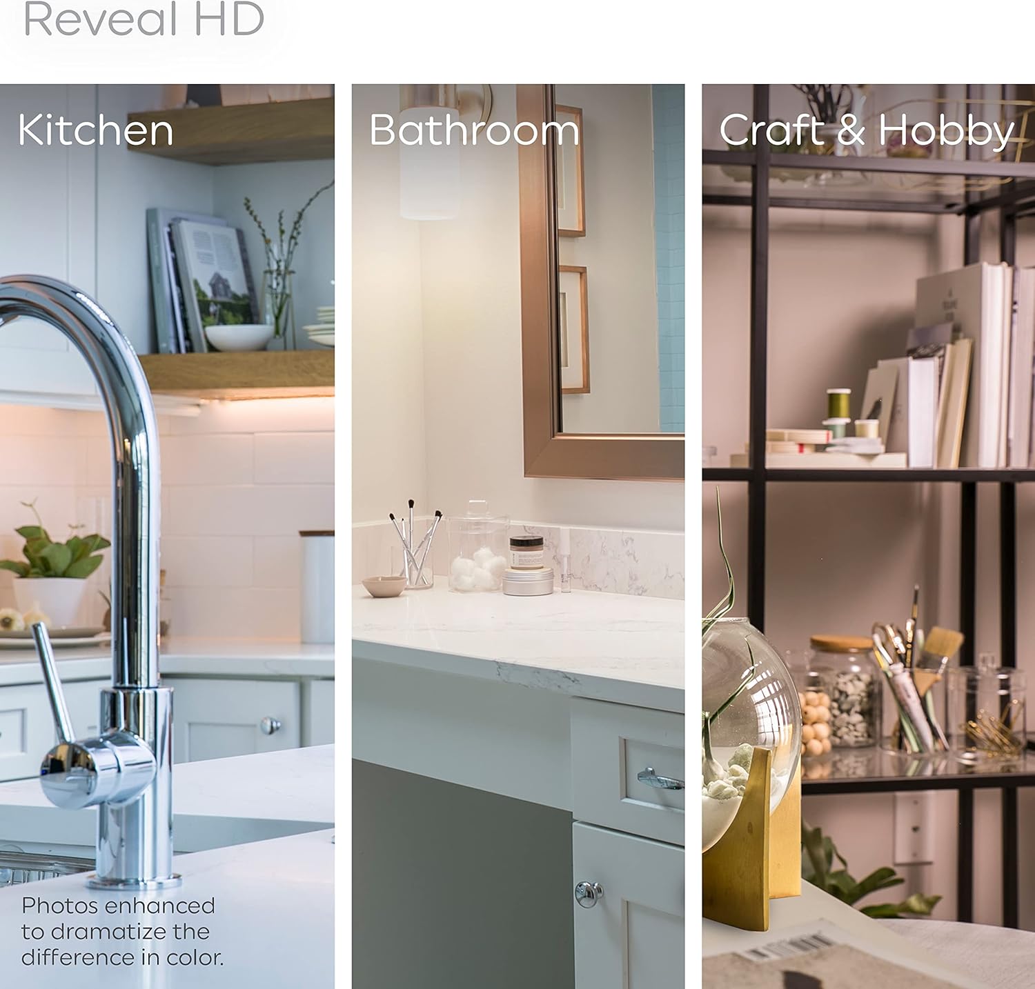 Our reveal light’s advanced color technology enhances colors and patterns. The result: balanced light that captures the crispness of daylight and warmth of soft white without harsh blue and yellow tones. It’s clean, beautiful light designed for every room. Change regular LED bulbs to the vivid, balanced high-definition light of reveal bulbs that deliver exceptional clarity.
