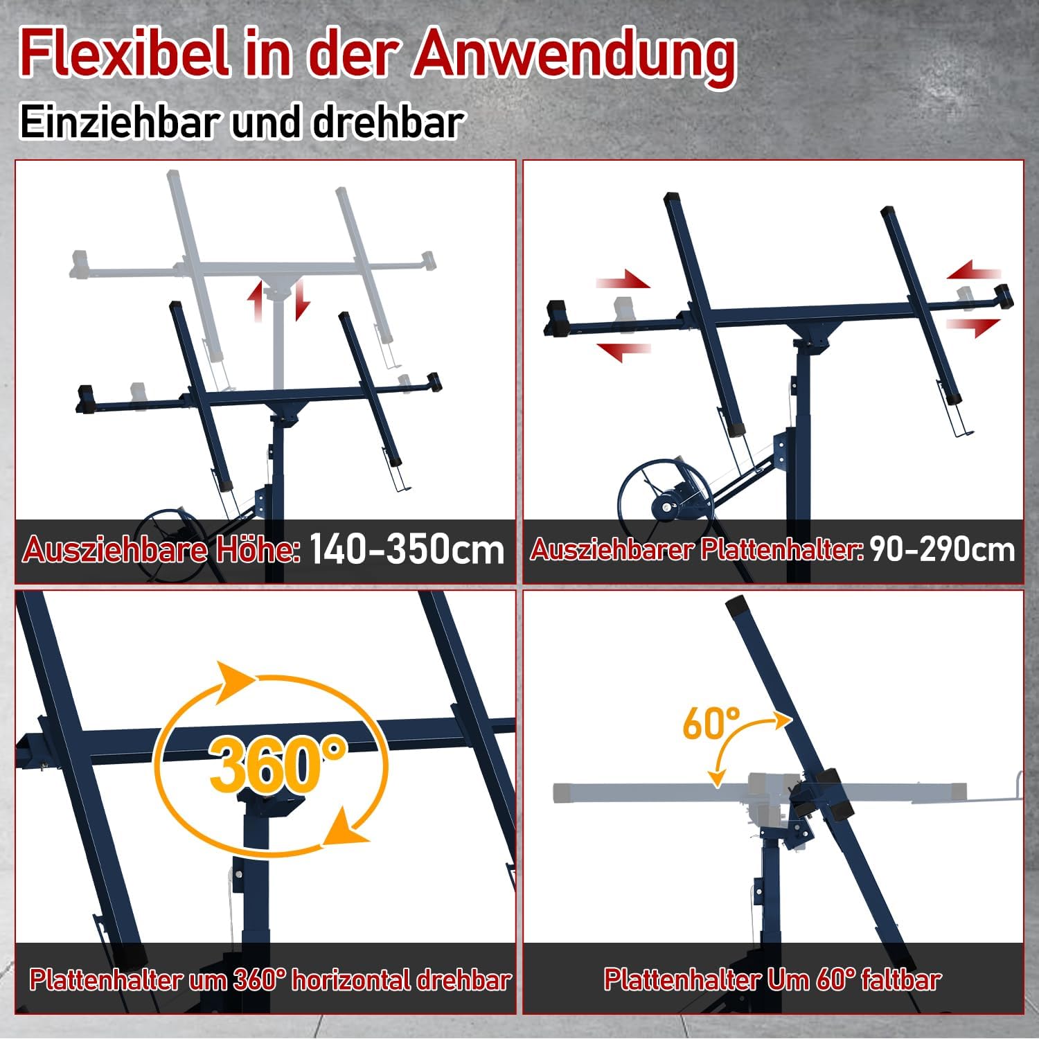 Plate riser base for stable support, indoor mounting aid and drywall Features: Quick mounting plate riser as mounting aid for interior and drywall. Lifts loads such as drywall, drywall, particle board, wood paneling, metal paneling, roofing boards up to a weight of 150 lbs for overhead mounting or sloped ceiling and wall mounting. The two loading arms can be extended up to 290 cm and have a width of 90 cm and are equipped with two brackets each. 3 large swivel wheels with arm arm diameter 100 mm. Practical crank mechanism completely pre-assembled. Efficient one-person operation by steering wheel and automatic brake. This practical ceiling mounting aid can be used for example in drywall and construction as a clamping aid. Of course, the hob lift is completely removable and comes partially assembled. Specifications: Dimensions: 140 x 140 x 140 cm. Weight: approx. 40 kg.