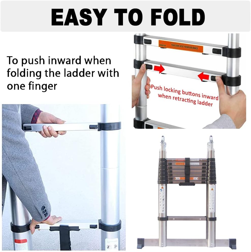 believe this small extension ladder can bring great convenience to your life.Telescopic Ladder Frame Compact Aluminum Extension Portable Telescopic Outdoor Camper Trips RV Tool Platform Stabilizer Bar One Button Retractable Collapsible with Non-Slip Feet Multipurpose Home Loft Ladders Attic Light Weight Easy to Carry Storage Step Ladder Alloy FoldableProduct Description: -Convenient to use and easy to carry-Great helper for both indoor and outdoor activities-Safe and compact----black non-slip rubber sleeve on the bottom of the ladder step and sturdy locking key between two adjacent steps to avoid impact and friction 8.5ft/2.6m Straight Telescopic Ladder-Number of ladder steps: 9-Step interval: 28cm/11.0in -Net weight: about 7.9kg -Max. Load: 150 kg -Material: stainless steel -Package size: 47cm x 79cm x 79cm -There may be a slight deviation during measurement, please be careful and thanks for your understanding Package included: 1×8.5FT telescopic ladder*** NOTE ----- Do not exceed the maximum total load of the telescopic ladder.