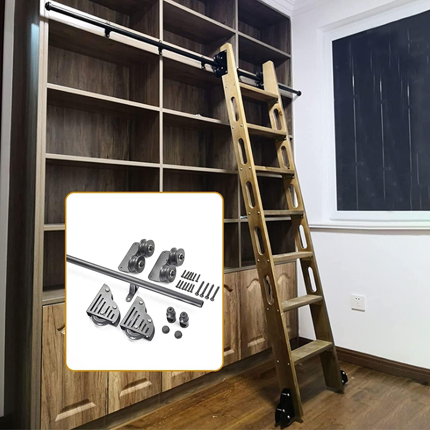 Round Tube Sliding Library Hardware Rolling Full Set Track Kit, turn your normal ladder into an innovative sliding ladder, is the best gift for friends, family, and lovers, which perfectly solves the troubles and dangers of taking things from heights. Suitable for libraries, attics, study rooms, schools, storage rooms, closets, wardrobes, wine cellars, garages, office, store room,cloakroom, bookstore and living rooms.Length: 3.3ft-20ft/100cm-600cm, more sizes can be spliced from these sizes, and the long slide rail is cut into several parts for easy assembly/disassembly/storage.( No Ladder)Installation requirements:The location of the installation track, the board must be 8- 10cm high ( at least 8cm), and it cannot be installed if it is less than 8cm. The thickness is at least 3cm!