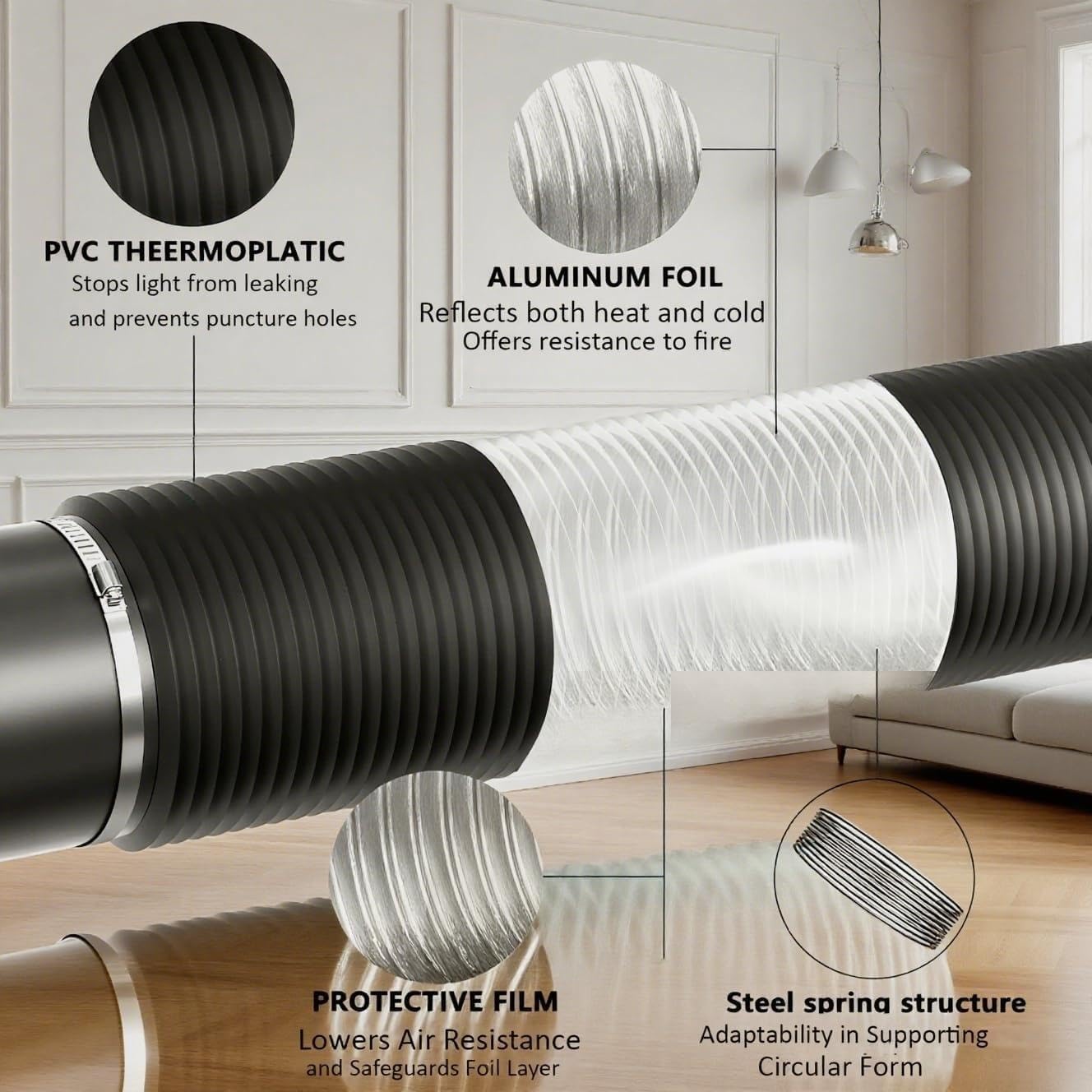 • 3-Layer Tough: The duct hose ensures that your ventilation system remains intact, free from rips and pinholes. This flexible duct is constructed with two layers of aluminum foil, along with a layer of PET and a steel wire helix, which helps maintain its shape and keeps your ventilation system protected from rips and pinholes.