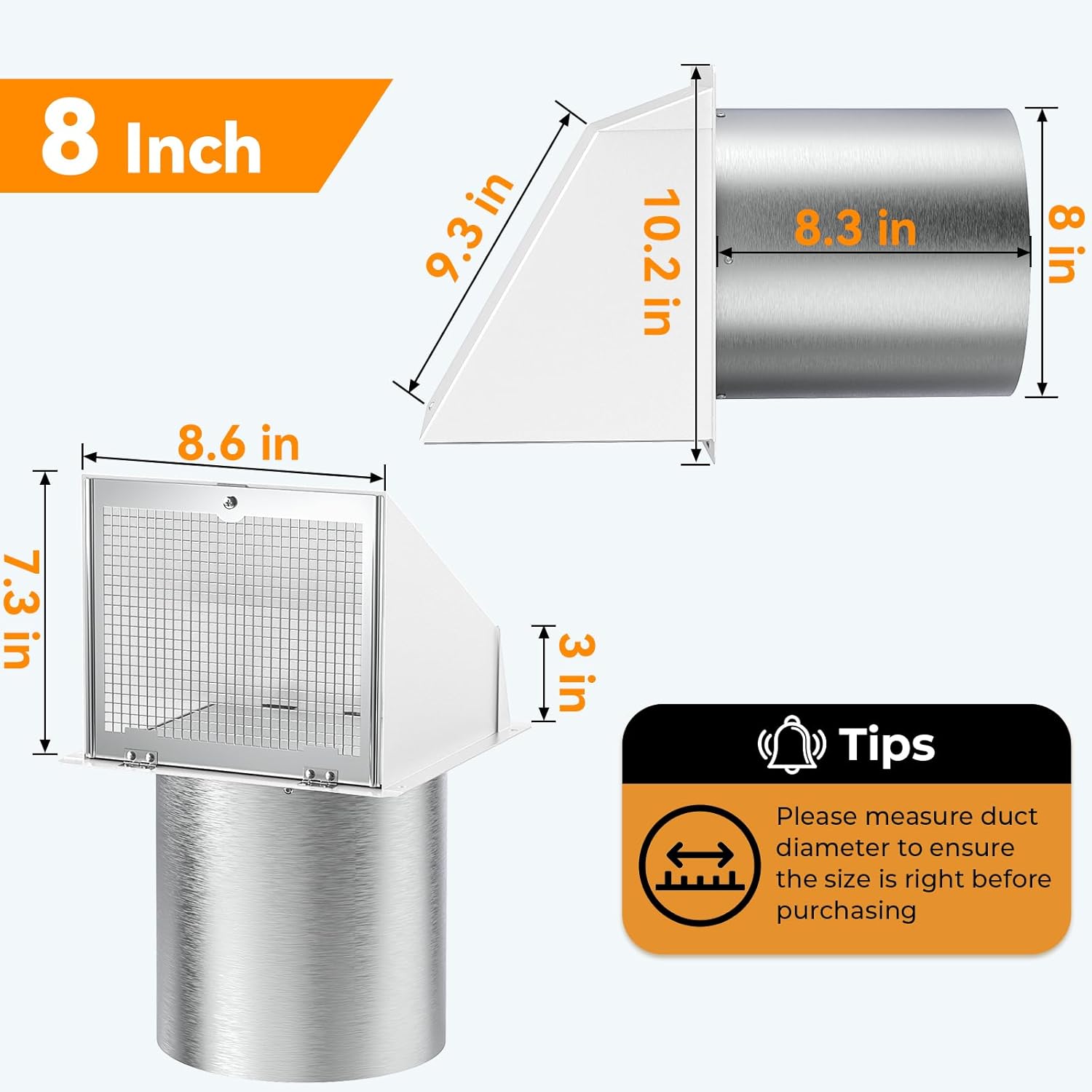 | Included Components | 1 x 8 Inch Diameter Wall Vent, 1 x Aluminum Foil Tape, 2 x Stainless Steel Pipe Clamp, 4 x Long Expansion Screws, 4 x Plastic Expansion Tube |