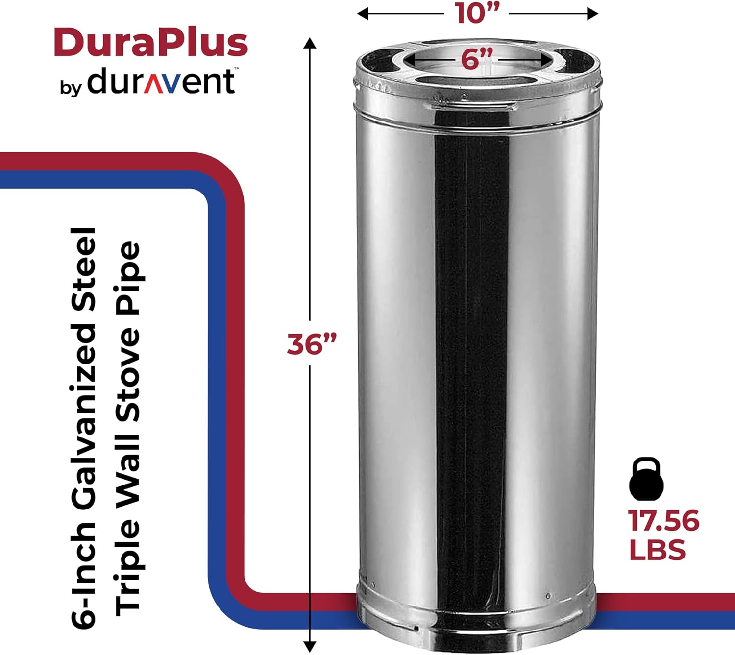 Stay warm and safe while cozying up by the wood-burning stove thanks to the DuraVent DuraPlus 6-Inch Galvanized Steel Triple Wall Stove Pipe, the latest icon of durability and style for your home heating needs. Designed to seamlessly blend functionality with aesthetics, this stove pipe is a must-have addition to any modern stove setup. Constructed from sleek 18-gauge galvanized steel, this triple-wall interior pipe connects wood stoves to your chimney, so your home stays toasty and smoke-free all season long. Great for venting exhaust caused by burning wood, oil, coal, and gas fuels, this 36-inch long connector features a lock-seamed design to run without drips or leaks, no sealant required. For quick and simple installation, the entire DuraPlus line features pipes with die-formed end fittings and a convenient twist-lock connection. With an installed length of 34.75 inches and a 6-inch interior diameter, this extension offers a snug fit on most wood stoves. A 2-inch clearance to combustibles is required for safe operation. The sleek silver finish not only adds a touch of elegance to your stove but also complements a wide range of interior designs. Make every winter warm and inviting while keeping your family safe from the fumes with the help of the DVL Triple Wall Stove Pipe by DuraVent.