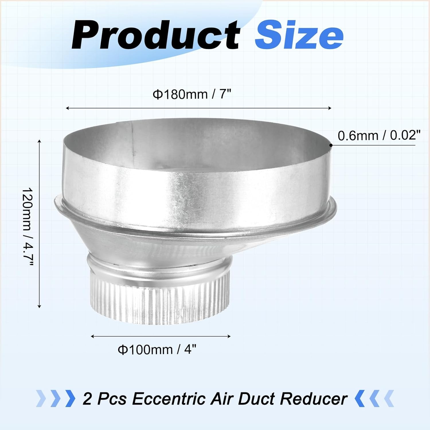 [WHAT TO GET]: The eccentric reducer pipe adapter is made of durable galvanized steel material, strong, waterproof, moisture-proof, wear-resistant, good toughness, strong pressure resistance, not easy to deform, can be used for a long time. Smooth interior surface can reduce the resistance of ventilation.[WHEN/WHERE TO USE]: This eccentric duct reducer and increaser are used as a duct adapter for duct diameter changes in the ventilation system. Suitable for the HVAC system, bathroom exhaust, air-cooled hood, embedded fans, hood, roller dryer, chimney, dust collection system, etc.[WHAT IT IS]: Interface outer diameter: 180 mm / 7 inch, 100 mm / 4 inch; Height: 120 mm / 4.7 inch, Thickness: 0.6 mm / 0.02 inch, Packaging content: 2pcs x Eccentric Air Duct Reducer[HOW TO USE]: Easy to install, connect the duct reducer to a metal air duct or vent hose, and use pipe clamps and tape to fasten the connection.[WHAT TO AVOID]: Please confirm the specifications and dimensions of the reducing duct connector before purchasing.
