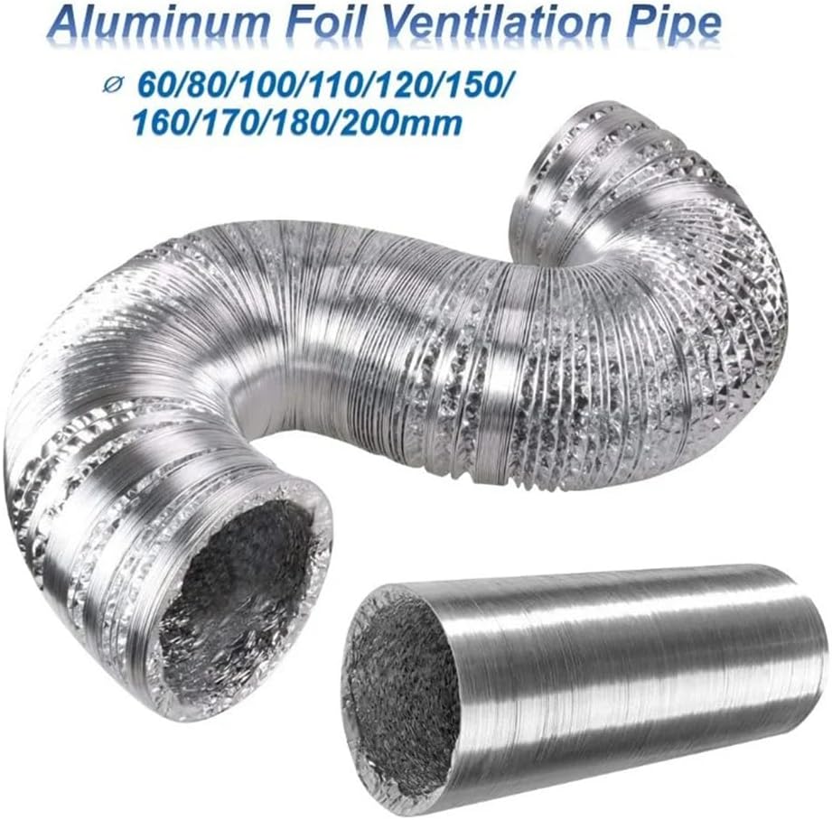 Size: Diameter: ∅60mm/80mm/100mm/110mm/120mm/150mm/160mm/170mm/180mm.Silver Encrypted Aluminum Foil Ventilation Pipe for Kitchen Bathroom, Material: PVC, Steel ring and fire-resistance coating.The removing heat from an enclosure, distributes CO2, increases temperature and humidity levels and etc. It is perfect for Heating Ventilation and Air Conditioning, kitchens, bathrooms, greenhouses, grow rooms, grow tents, etc.Made by overlapping double-layer aluminum foil. Fireproof material, non flammable. Non rigid elbow, suitable for various walls, integrated molding.With a 1.0-1.2mm steel ring embedded in the middle, which can be bent freely and is not easily deformed.