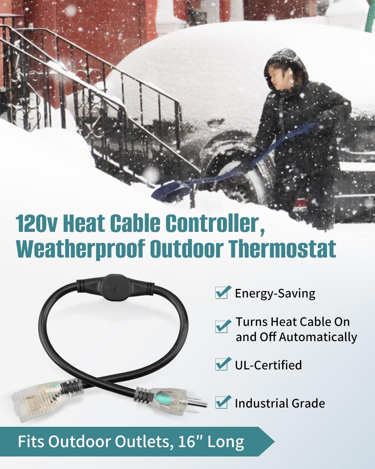 Name: Heat Cable ControllerOperating Temperature: Thermostatic Outlet Plug turns heating cables and other electrical equipment on at 37ºF and off at 50ºFSpecs: 120 volts, 15 ampsSafety: Temperature Controlled Outlet, 14 AWG wire size, UL listed