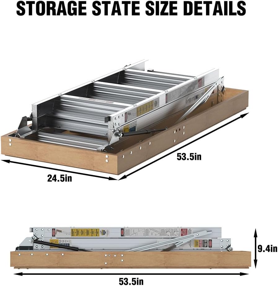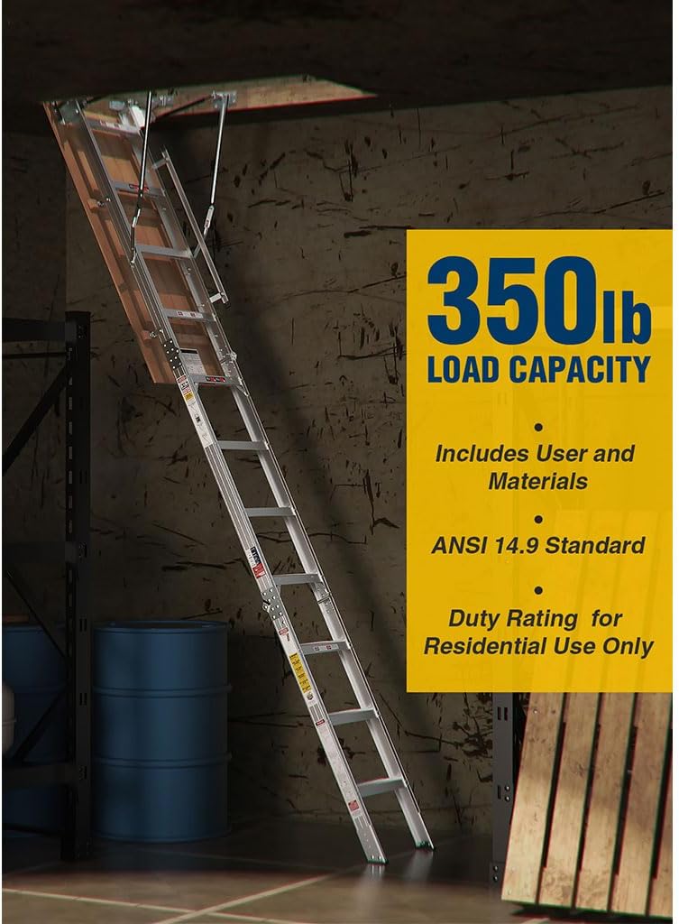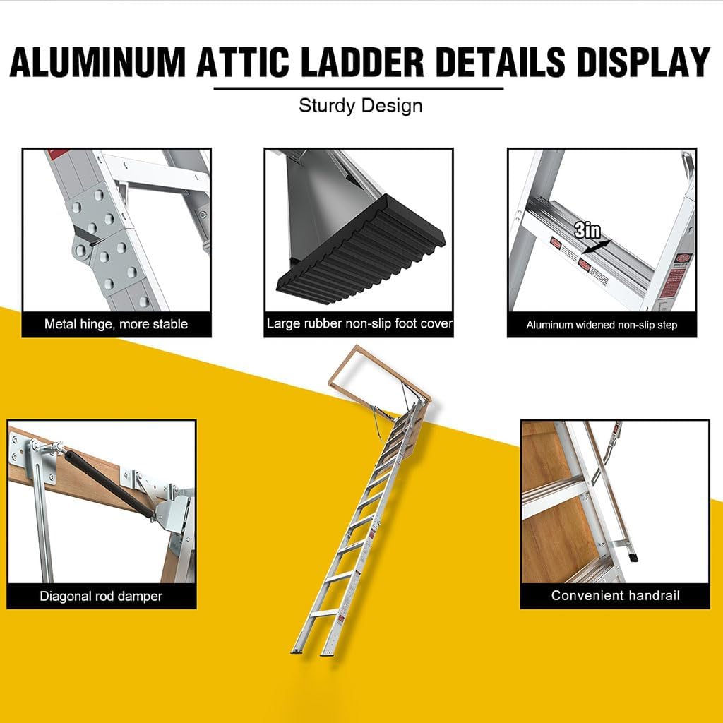 SpecificationsProduct Type: Attic LadderMaterial: Aluminum, UV VeneerColor: SilverOverall Load Capacity: 350 lbsProduct Dimensions: 53.5"L x 24.5"W x 9.4"HRough Opening Dimensions: 24" x 54"Ceiling Height Compatibility: Fits ceilings from 7'8" to 10'3"Item Weight: 50 lbsPackage Contents1 x 10-Foot Aluminum Attic Ladder1 x Assembly Manual with Step-by-Step Instructions