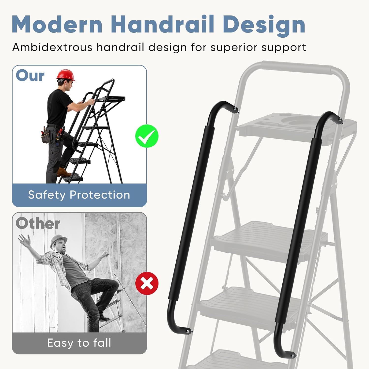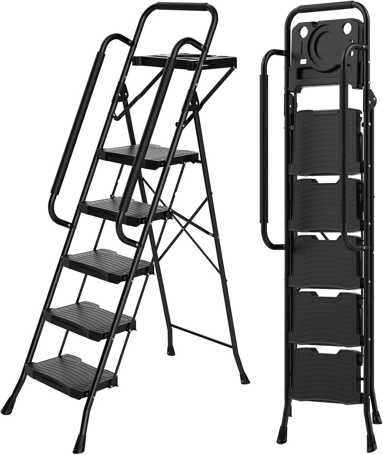 This versatile step ladder combines portability, safety, and strength for all your home and workspace needs. The ultra-lightweight yet sturdy steel frame folds down to just 2 inches thin for effortless storage in tight spaces like closets or behind doors, while supporting an impressive 800lbs weight capacity thanks to its reinforced cross-brace design and auto-locking metal buckle for maximum stability. Wide anti-slip pedals with a textured particle surface provide secure footing, while the soft rubber handgrip and thickened non-slip feet ensure confident use on any surface.Multi-purpose ladder is perfect for reaching high shelves, changing light bulbs, painting projects, and countless other tasks around the house, garage, or office. Durable, safe, and space-efficient, it's the ultimate solution for any household or work.