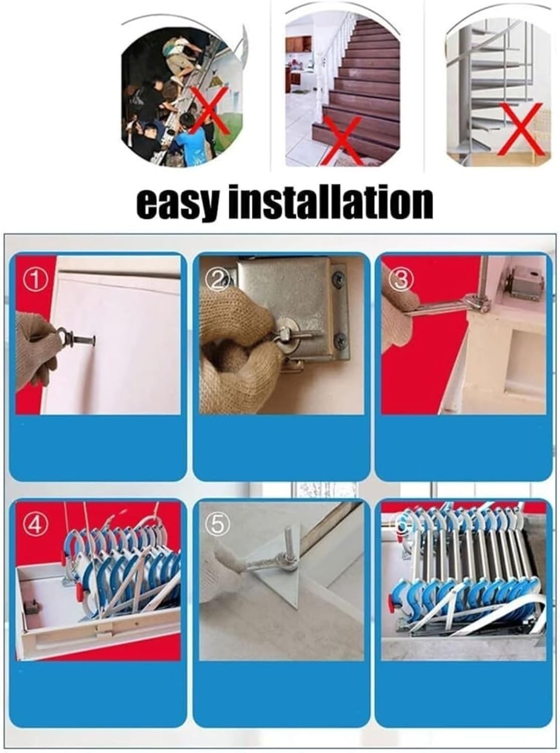 Attic stairs make previously inaccessible attic spaces readily accessible, greatly improving the utilization of the attic area.Product Name: Electric Telescopic Attic LadderSpecificationsMaterial: Cold-rolled steel, PVC, stainless steel, wood, medium-density fiberboardType: Ceiling-mountedLoad Capacity: 300 kg / 661.39 lbsTotal Height: 290-310 cm / 9.51-10.17 ftInstallation Vertical Height: Less than 3.5 m / 11.48 ftTotal Step Width: 44 cm / 17.32 inStep Dimensions: 40 x 14 cm / 15.75 x 5.51 inStep Spacing: 24-25 cm / 9.44-9.84 inApplicable Door Opening Dimensions: 70 x 90 cm, 70 x 100 cm, 70 x 120 cm, 80 x 90 cm, 80 x 100 cm, 80 x 120 cmInstructions: Use of all accessoriesNote:Please note that this pull-down attic ladder is suitable for ceiling mounting only.Compared to moving, unstable, and dangerous straight or A-frame ladders, fixed attic stairs offer a more stable and safer way to go up and down, especially for situations requiring frequent movement or carrying of items.