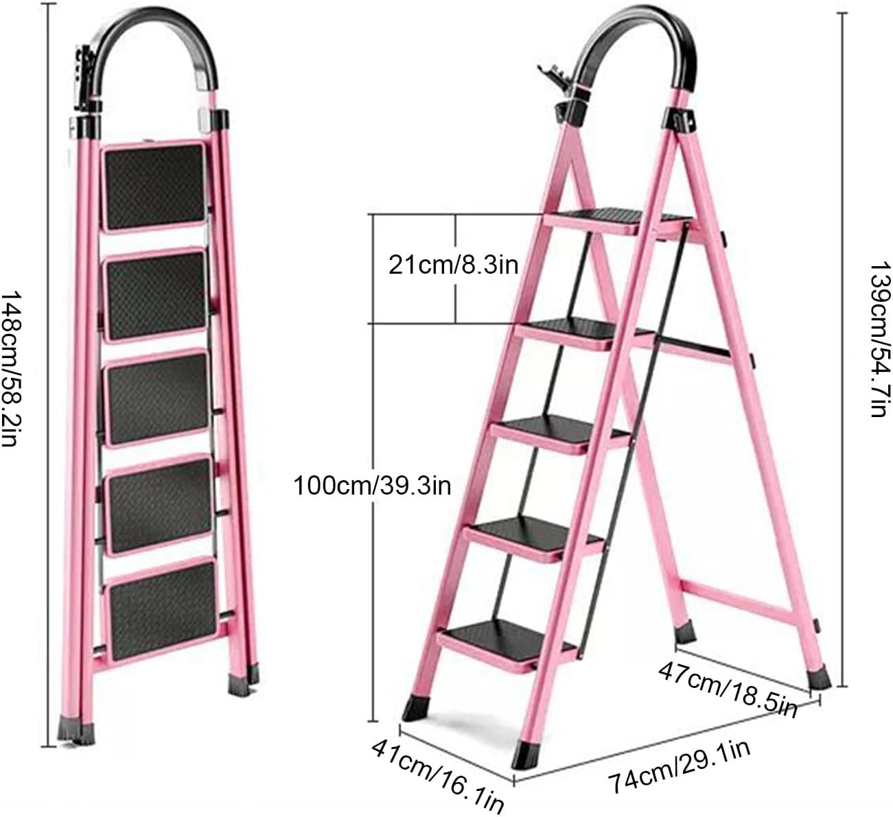 Why Choose Our Ladder?- Foldable & Space-Saving- Lightweight & Portable- Multi-Use Ladder- Widen Non-Slip Steps- Safety Handle on Top- Non-Slip Feet- Stable without WobbleSpecification:- Material: Carbon Steel- Max Load Bearing Capacity: 150kg/330lbs- Expend Dimension: 41 x 74 x 139cm/16.1 x 29.1 x 54.7''- Folding Dimension: 148 x 47 x 5cm/58.3 x 18.5 x 2''Warm Tips:- Manual measurement, the measurement value has 1-3cm error, please refer to actual size