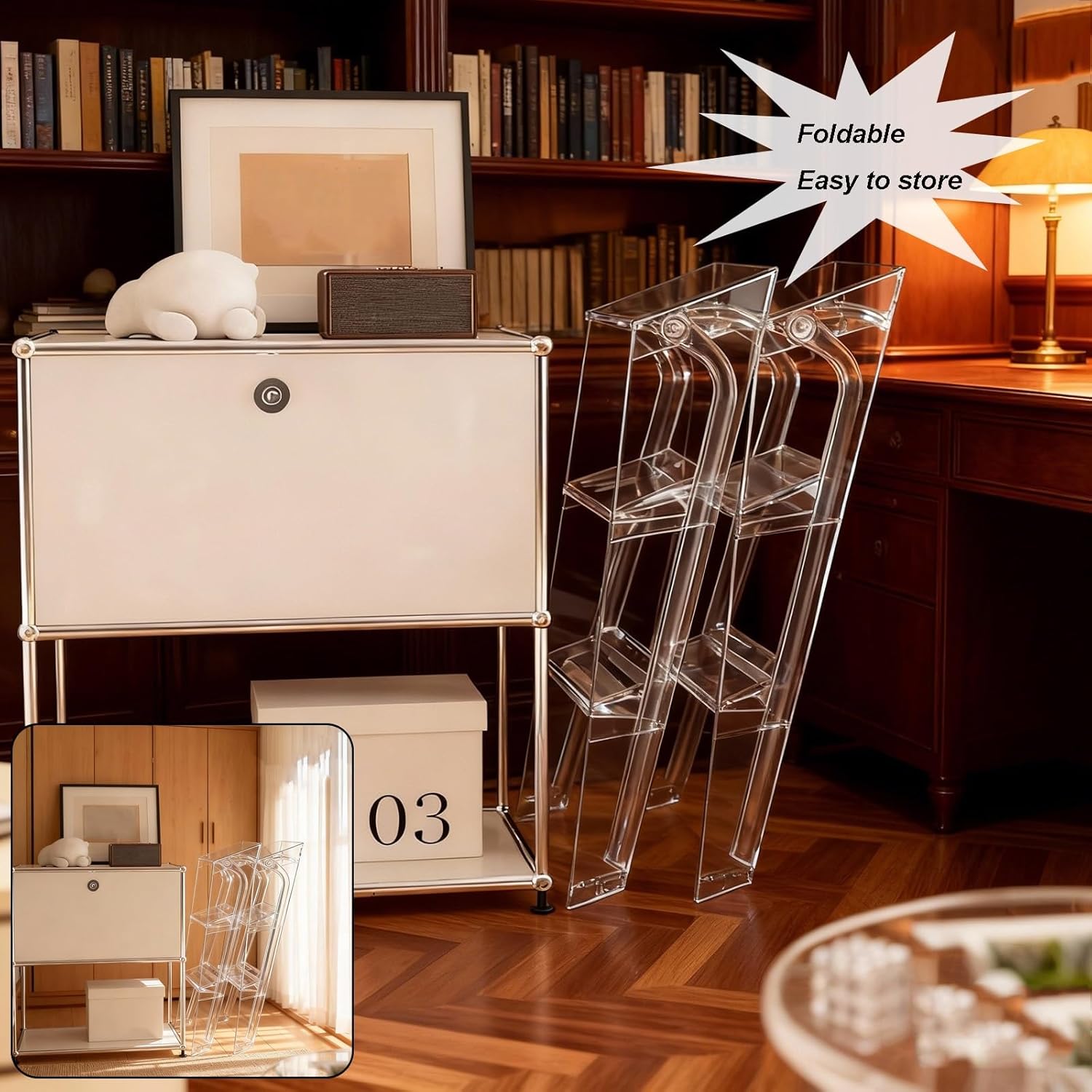 Product Name: Multifunctional Home Folding Ladder StoolPrimary Material: PC + Electroplated Steel TubingProduct Color: TransparentApplications: Step ladder, storage rack, plant stand, bookshelf, shoe rackReinforced locking slots ensure flexible structure and smooth folding for effortless opening/closingElectroplated steel legs crafted from premium-grade steel deliver high strength Silicone non-slip pads with thickened material and reinforced legs provide dual slip resistanceSpace-saving design, effortless folding, compact size for convenient storage without clutterFolds for storage, flexible folding saves spaceCan be stored in closets, corners, or narrow gapsFits easily in any indoor cornerProduct Listing: Step stool x1 (Other accessories not included)Important Notes:Due to manual measurement, slight variations may occur.Color differences may appear due to photography equipment, angles, and lighting conditions.The ladder is manufactured using injection molding. Some units may exhibit silver-line-like scratches or flow marks. These are not cracks but production-related marks that cannot be entirely avoided and do not affect product functionality.