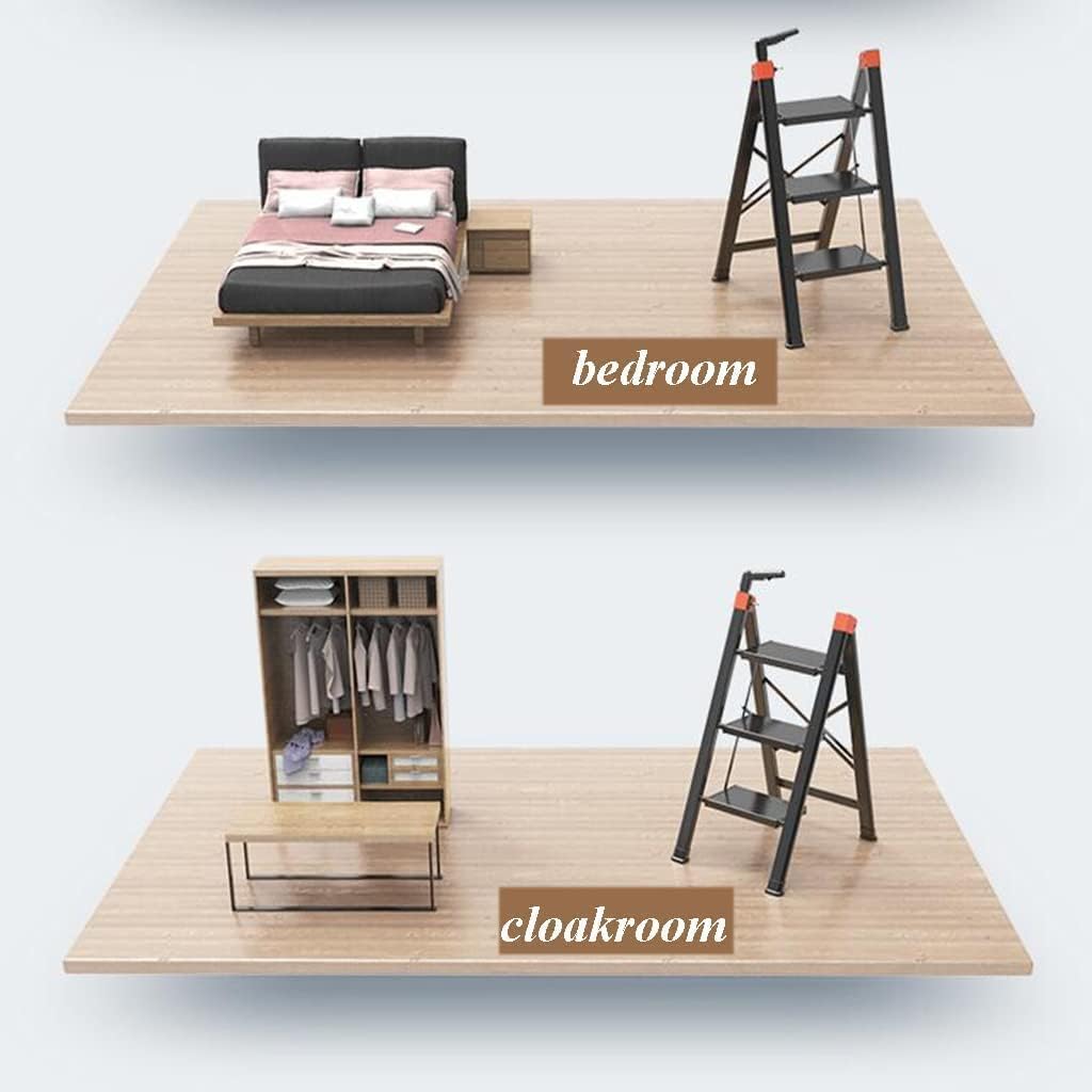 Easy Storage with Compact Design: The step ladder can be folded, quite portable & space-saving for storage. It's portable in your car trunk, or can be carried everywhere. Compact enough to slide under a bed, stash in a closet / behind a door, or simply lean against a wall.Ladder Type:Telescoping Ladders/Folding Ladder/Step Ladders Product material: aluminum alloyProduct color: black, champagne Product size: three -step ladder handrail (weight: 5.1kg/11.24lb); four -step ladder handrail (weight: 6.24kg/13.76lb); five -step ladder handrail (weight: 7.42kg/16.36lb) ; Two -step ladder (weight: 2.8kg/6.2lb)Product load: 150kg/330lbLadder type: multi -function folding ladderWide Range:for home, attic, RV, outdoor work, building maintenance, window cleaning, decoration workPackage Included:1 x Ladder (excluding any products)Features: 1. Wide and large pedals, with deepened lines on the surface, not easy to slip. The ladder structure is more stable; 4. Horseshoe-shaped foot cover, grip and multi-layer floor.Wide Application:This ladder is a must-have for cleaning, painting, decorating, and all your DIY projects, it allows you to effortlessly reach those hard-to-access areas, perfect for home offices and both indoor and outdoor use, it takes the hassle out of your DIY or cleaning tasks, with this ladder, you can easily complete your projects.