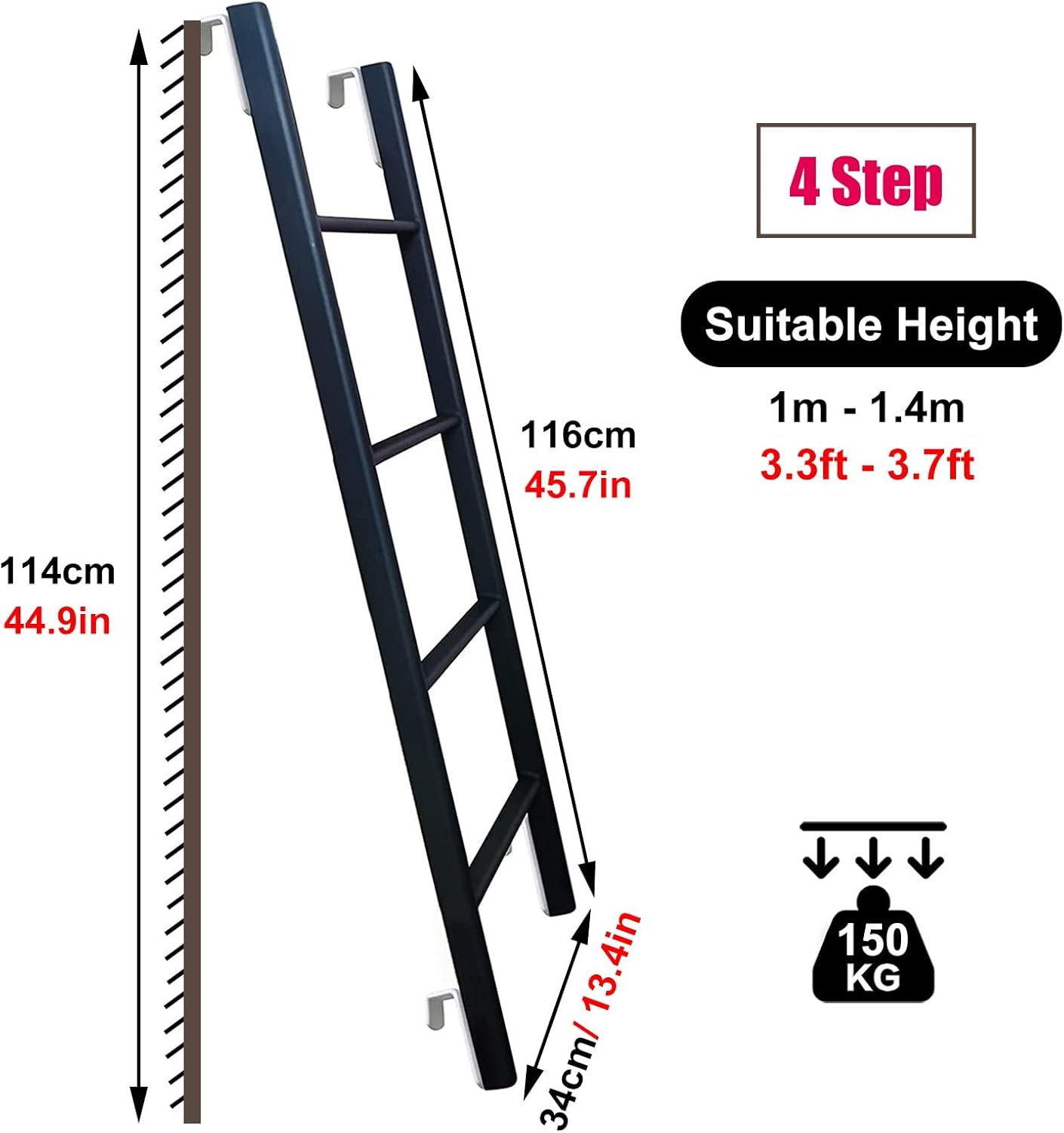 Whether it's meant for your child to climb up into bed or for you to kiss them goodnight, bunk bed ladder is a stable camper bunk ladder.🚀 Package contents ● 1 × Bunk Ladder (Including All Mounting Accessories)🚀 Specification● Material: Metal iron● Optional Sizes:4 Steps: 34cm x 116cm/ 13.4inch x 45inch4 Steps: 34cm x 130cm/ 13.4inch x 50inch4 Steps: 34cm x 140cm/ 13.4inch x 55inch5 Steps: 34cm x 150cm/ 13.4inch x 59inch● Overall Width: 34cm/ 13.4inch● Rung Dimensions: 33cm x 3cm x 1.5cm / 13inch x 1.2inch x 0.6inch (Width x Depth x Thick)● Load Capacity: 150kg/ 330Lbs● Whether to Assemble: Yes🚀 Features● Easy storage and transport, lightweight, compact, sturdy, portable.● It can also be used as an attic ladder, loft ladder or RV ladder, it's a multipurpose ladder. ● This bunk bed ladder can save space for you without always taking up valuable floor space. ● All hardware and hooks are included, very easy installation and disassemble, just look at the parts, you will figure it out and can assemble it in a few minutes. 🚀 Kindly Note● Due to different manual measurement methods, the error is 1-2 cm. ● We try our best to make pictures close to the real, BUT lighting, contrast and color display may cause color difference. 🚀 After-Sales Service ● If you need other sizes or colors, you can contact us by email, we support personalized customization. ● If you have any questions about our products or orders, please contact us by email, and we will be happy to assist you and respond to you within 24 hours.● With the aim of \u201cThe Best Quality and Optimum Service\u201d, we are your best choice and faithful friend.
