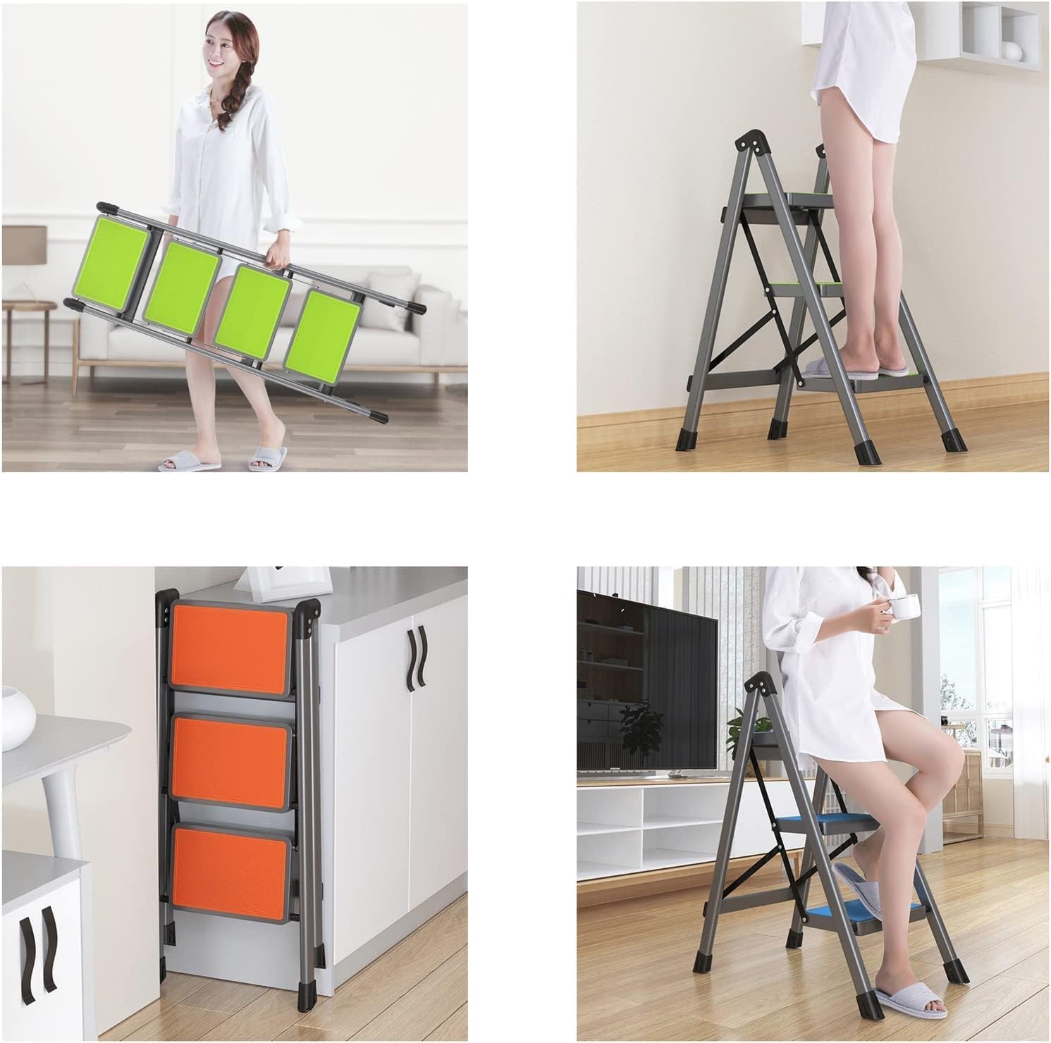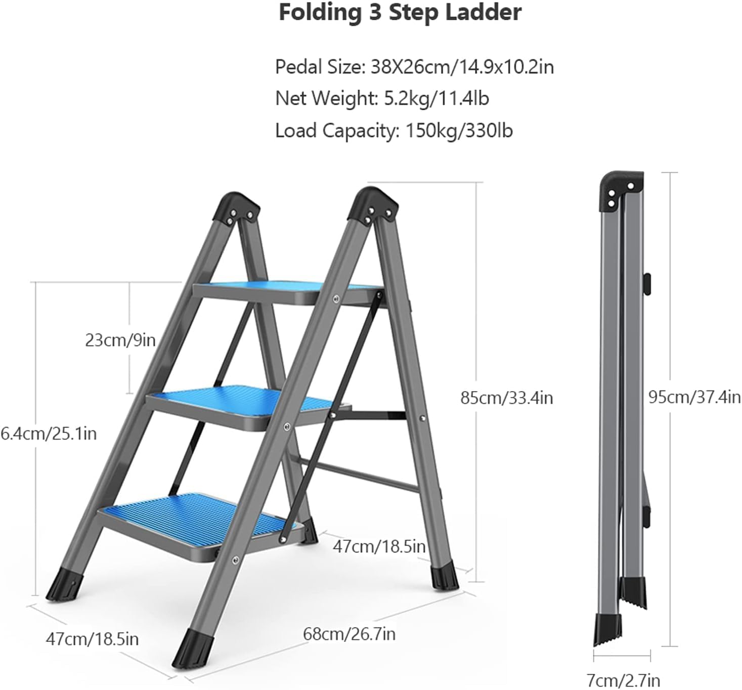Notice! ! ! The latest upgrade thickened material! ! !After years of research and practical proof: We have newly upgraded the thickened and wear-resistant new materials of the ladder. The newly upgraded version of the material ladder not only saves space, but also has more wear-resistant and safer features. It is more durable and very stable than the previous material. We have improved the quality and extended life of the attic stairs with new upgraded materials.Features: Foldable, Non-slip Tread, Integrated Molding, Easy to Store, Strong Load-Bearing, Sturdy MaterialProduct name: Step Ladders/Attic Telescopic Ladder/Folding Ladder/Attic Ladder/Ladder Folding Step /Step Stool /Extension LadderMaterial: Metal Iron, PlasticColor: Blue, OrangeSpecification: 3 Step, 4 Step3 Step Expanded Size: 68x47x85cm/26.7x18.5x33.4in3 Step Folded Size: 7x47x95cm/2.7x18.5x37.5in4 Step Expanded Size: 83x48x108cm/32.6x19x42.5in4 Step Folded Size: 7x48x121cm/2.7x19x47.6inPedal Size: 38x26cm/14.9x10.2inLoad Capacity: 150kg/330lb3 Step Net Weight: 5.2kg/15.4lb4 Step Net Weight: 7.1kg/20.9lbWarranty_Description: 1 year warrantyContact information of the manufacturer: Qiongshan District, Haikou, Hainan ProvincePacking list: 1 x Folding LaddeNotice:1. Do not stand under the ladder when installing the ladder.2. Do not exceed the carrying capacity.3. Please make sure to place it on a flat ground; keep it away from children.